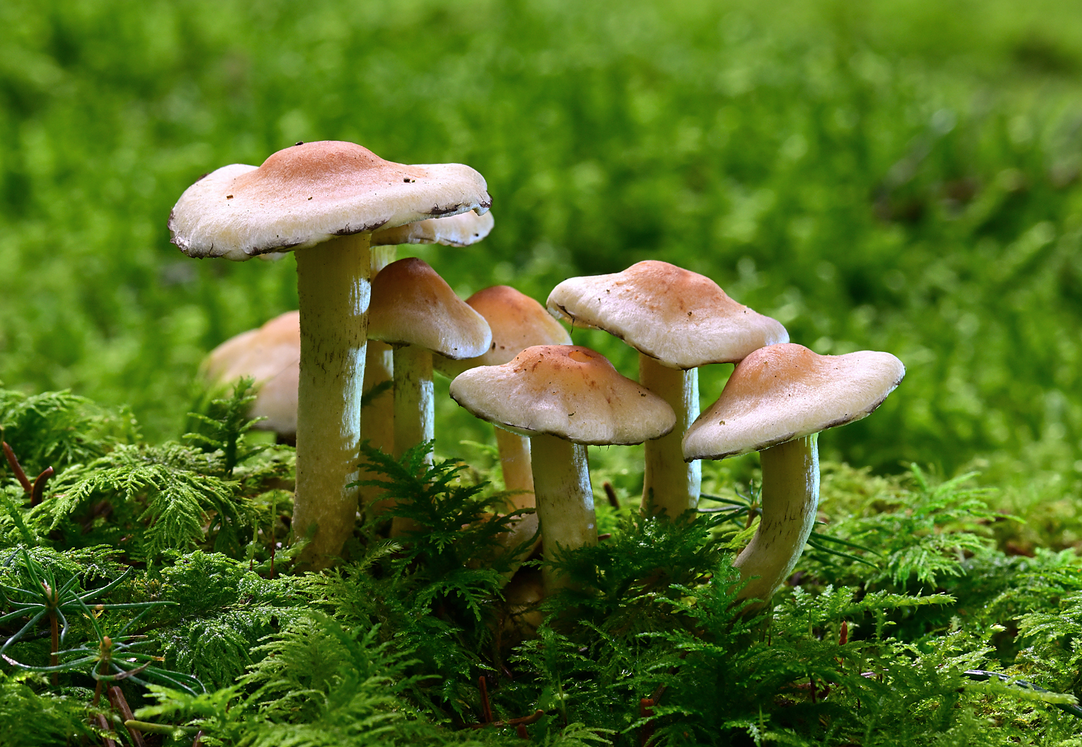Een leuk groepje van een soort waar ik ook nog nooit van gehoord had. Ik lees dat de soort op verrot naaldhout groeit, dus dat je ze in een naaldbos vindt pas goed. Het groen waar de groep in staat vind ik mooi, ook de uniform groene omgeving. Ik denk wel dat een iets groter diafragma de achtergrond wat rustiger had gemaakt.