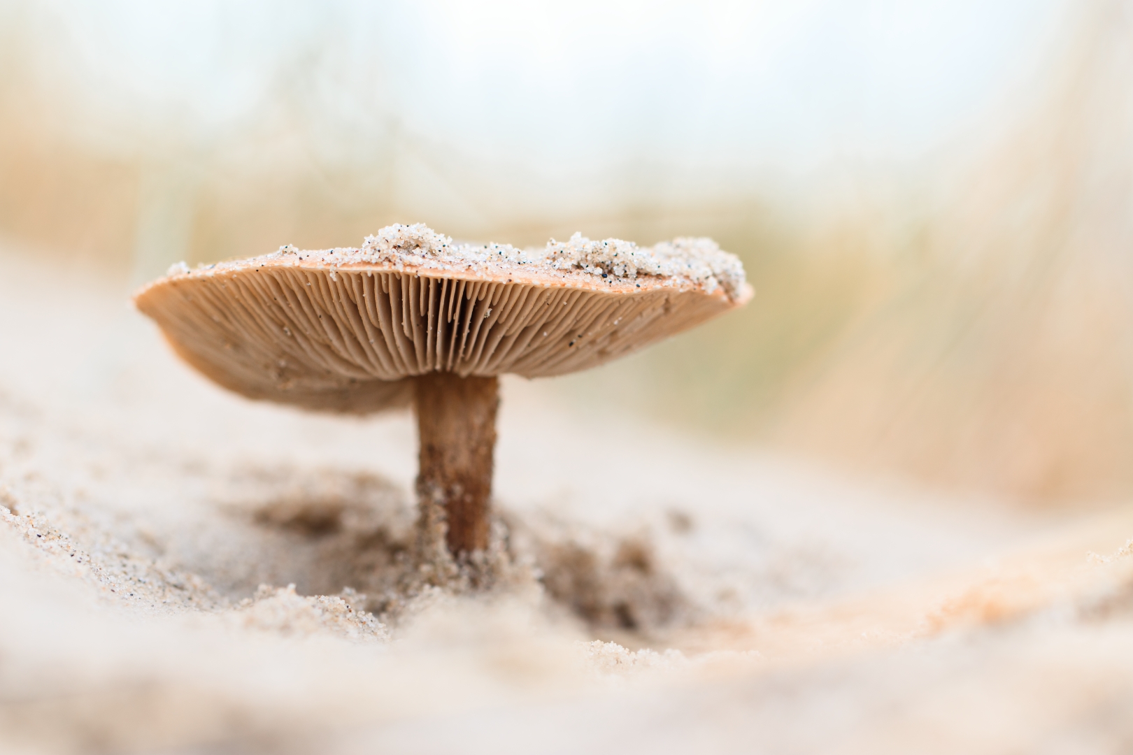Macro opname van een duinpaddenstoeltje tussen het helmgras in de Zeeuwse duinen.