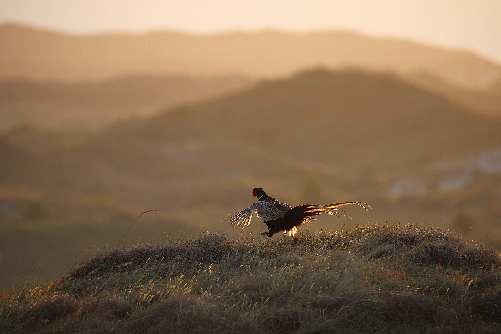 Dat een fazant kraait heeft verschillende redenen :territorium verdedigen, vrouwtje lokken en dominatie vertonen en dat de fazanten in de duinen van Texel dat veelvuldig deden gaf mij de gelegenheid om daar (heel veel ) foto`s van te maken o.a. deze met tegenlicht van de ondergaande zon.