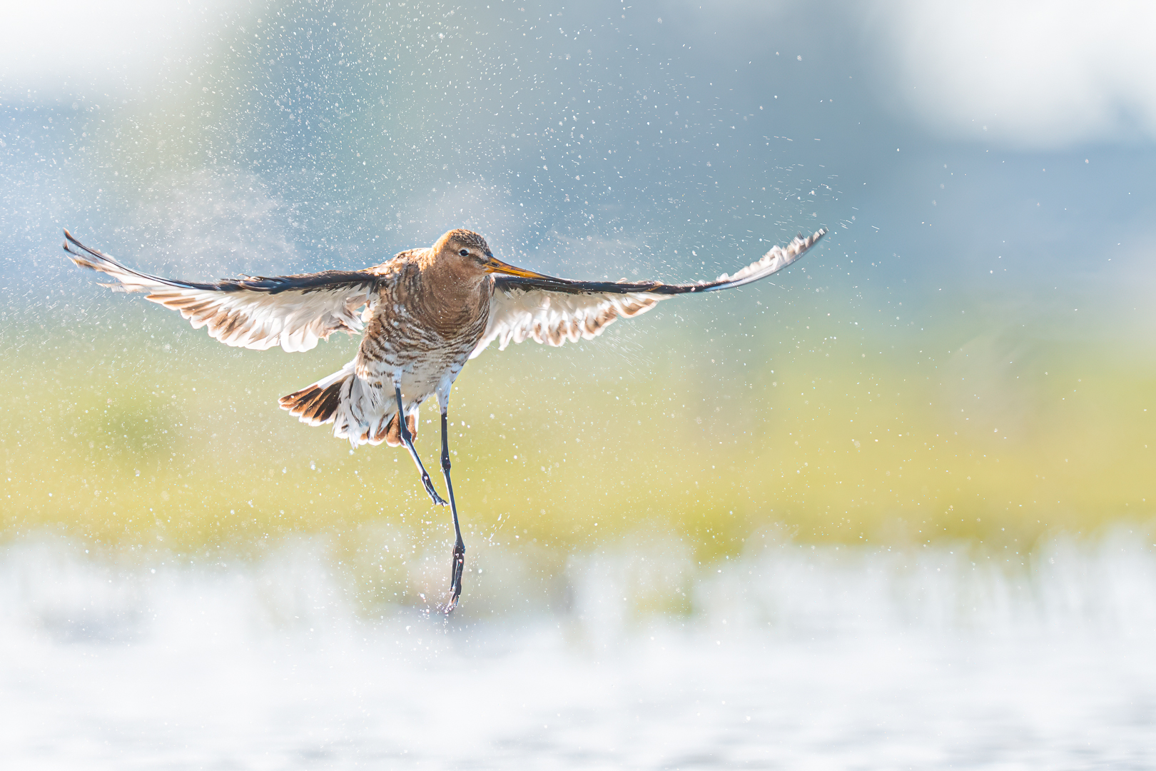 De lichte afwerking geeft de foto helemaal het bijpassende lentegevoel hoewel je in zo'n tegenlichtsituatie ook juist voor donker kan kiezen. Prachtig gespetter, mooie houding van de Grutto en fijne zachte kleuren in de achtergrond.