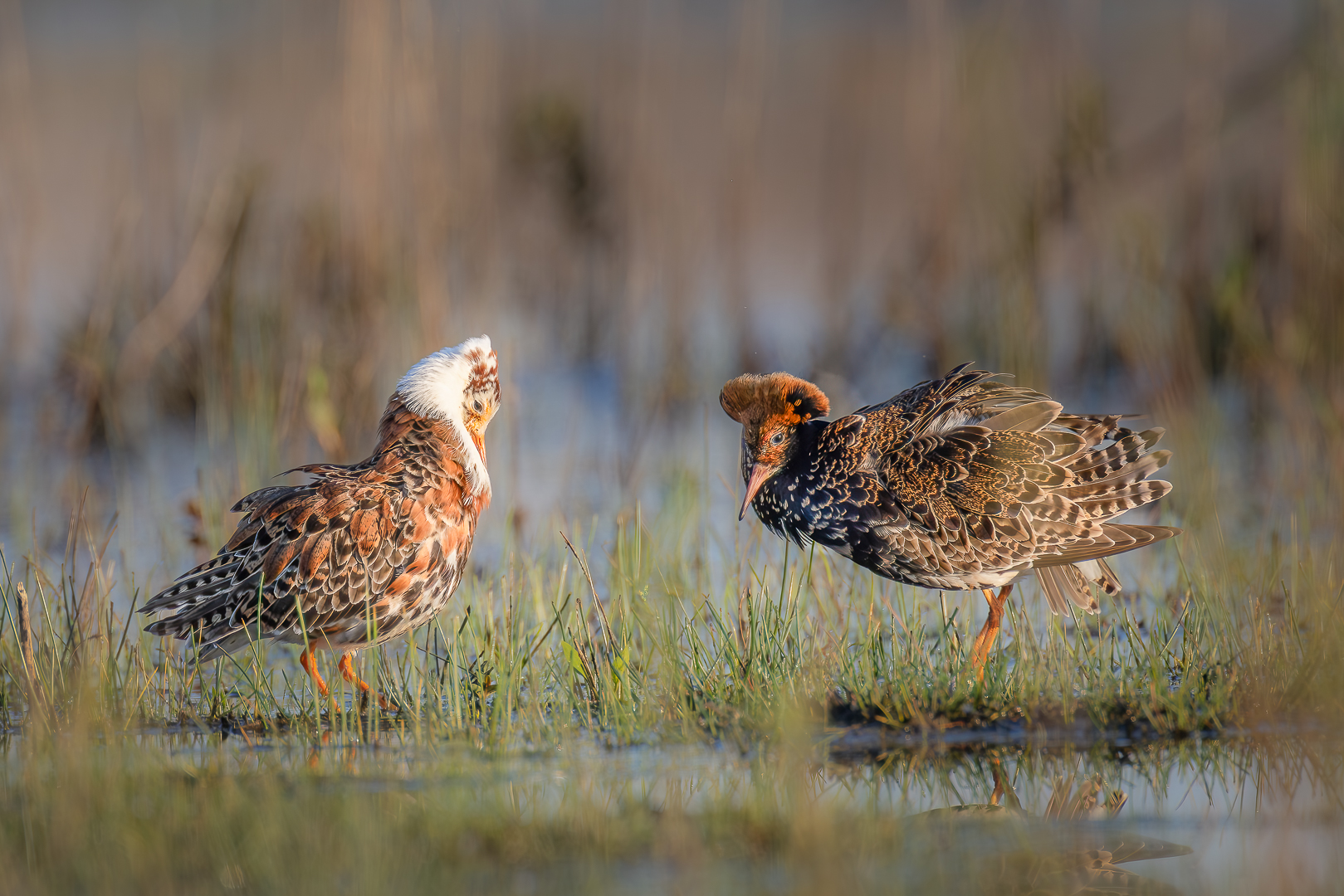 Dit jaar komt half Nederland de kemphanen fotograferen in de Binnenveldse Hooilanden, Gelukkig is dat 'mijn achtertuin' en fiets ik er graag mijn rondje. Ik ben maar een paar keer geweest bij de plas waar de kemphanen zich ophouden, en dan ook nog maar kort -vroeg in de ochtend- want het is er mij veel te druk. Dit beeld toont de karakteristieke interactie van twee mannetjes met totaal verschillend uiterlijk.