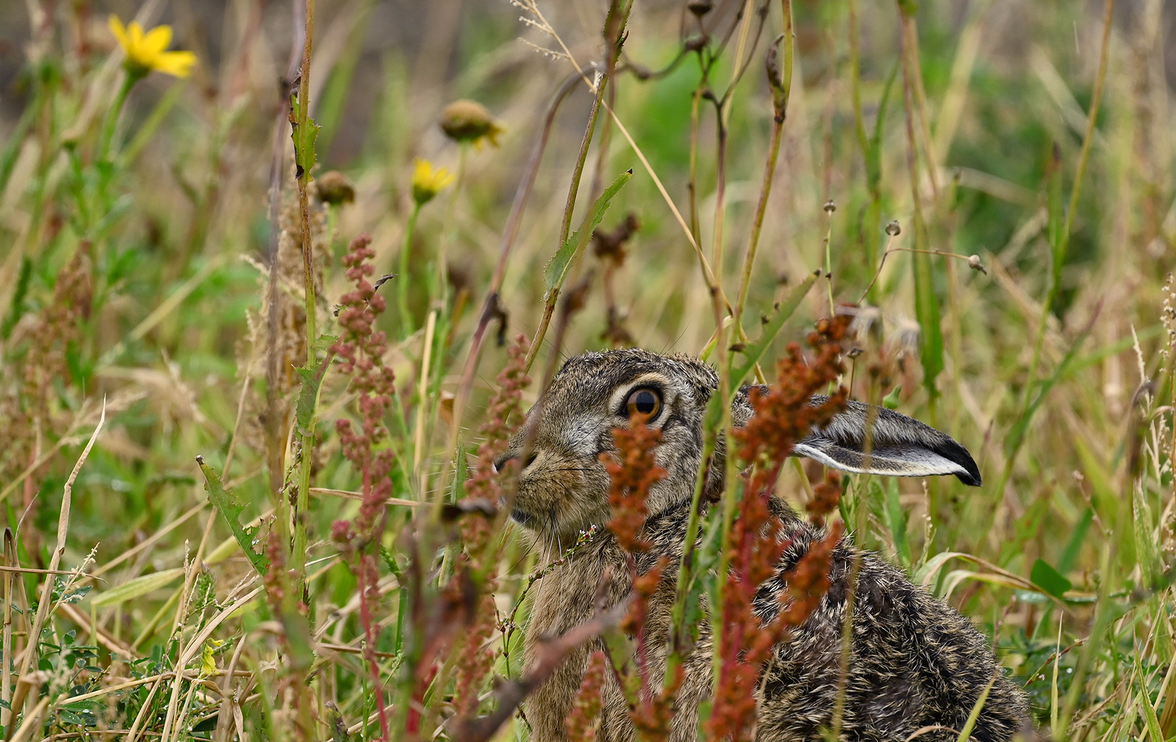 Een haas in de bloemrijke akkerranden bij Renesse, vond het verborgene wel leuk in de foto en heb besloten dat het gele bloemetje moest blijven
