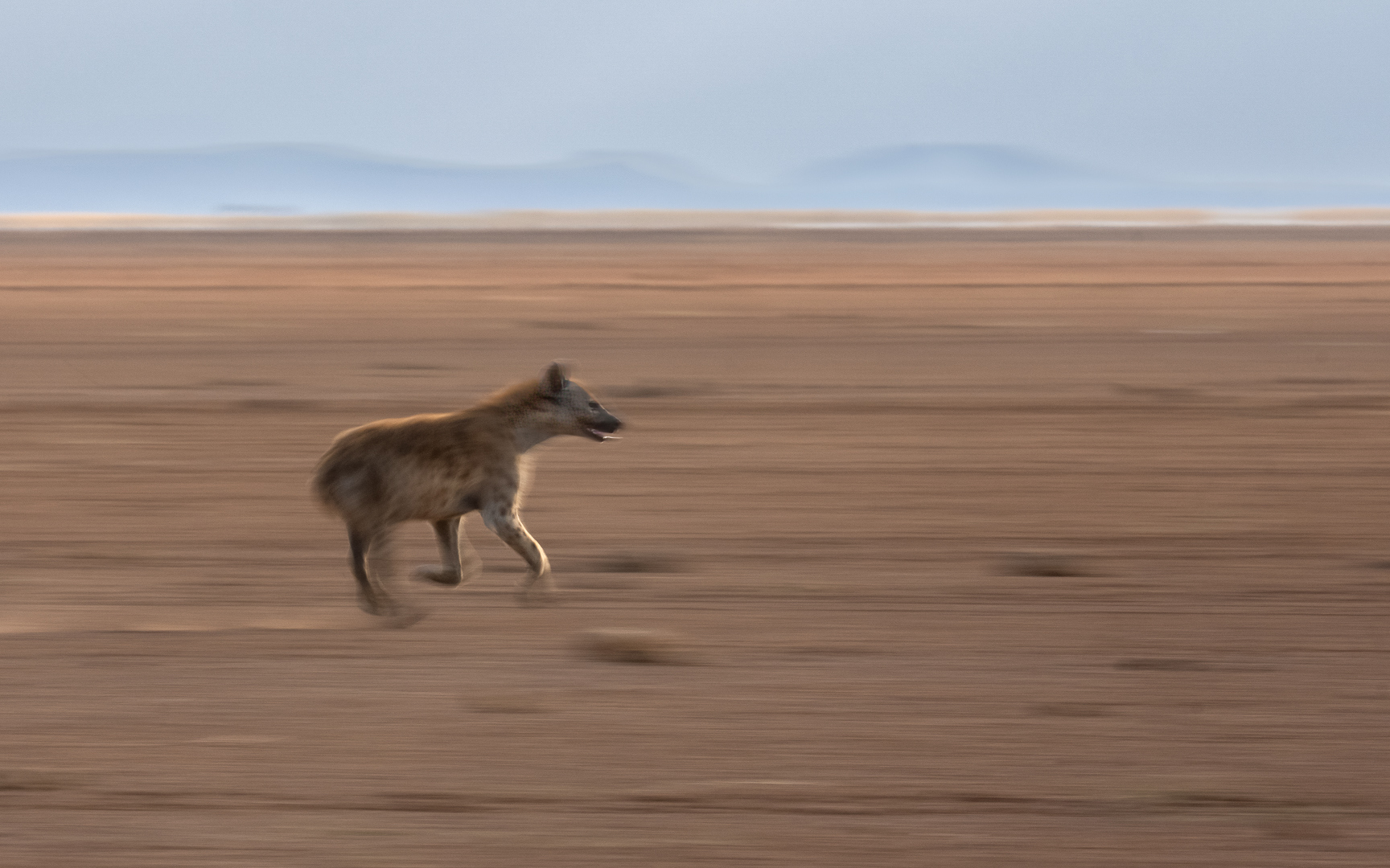 Dit soort fotografie is inderdaad 90% prullenbak en daarna 9% twijfelgeval. Maar als er dan toch ééntje bij zit die wel is gelukt heb je wel meteen iets bijzonders. Zeker in dit licht en met dit landschap De beweging zit goed in de plaat, de Hyena voldoende herkenbaar en net voldoende scherp op de kop.