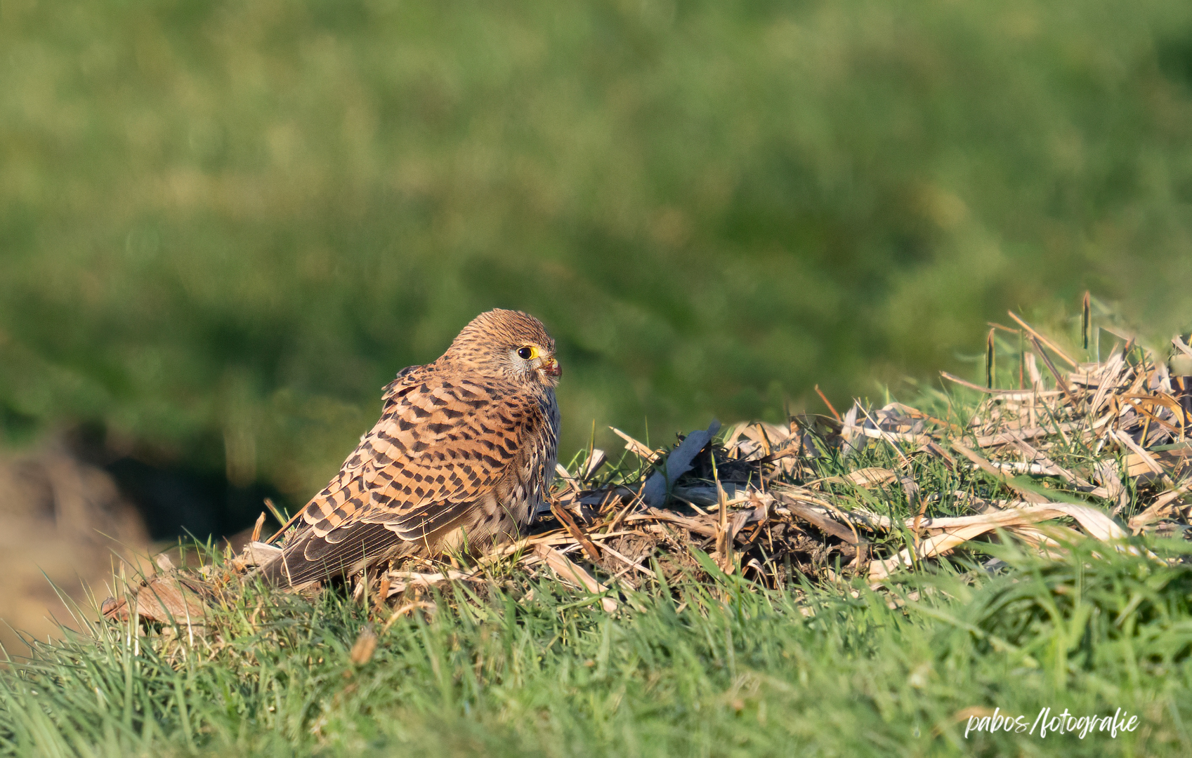 Torenvalk, vrouw, heeft een kraai geslagen.