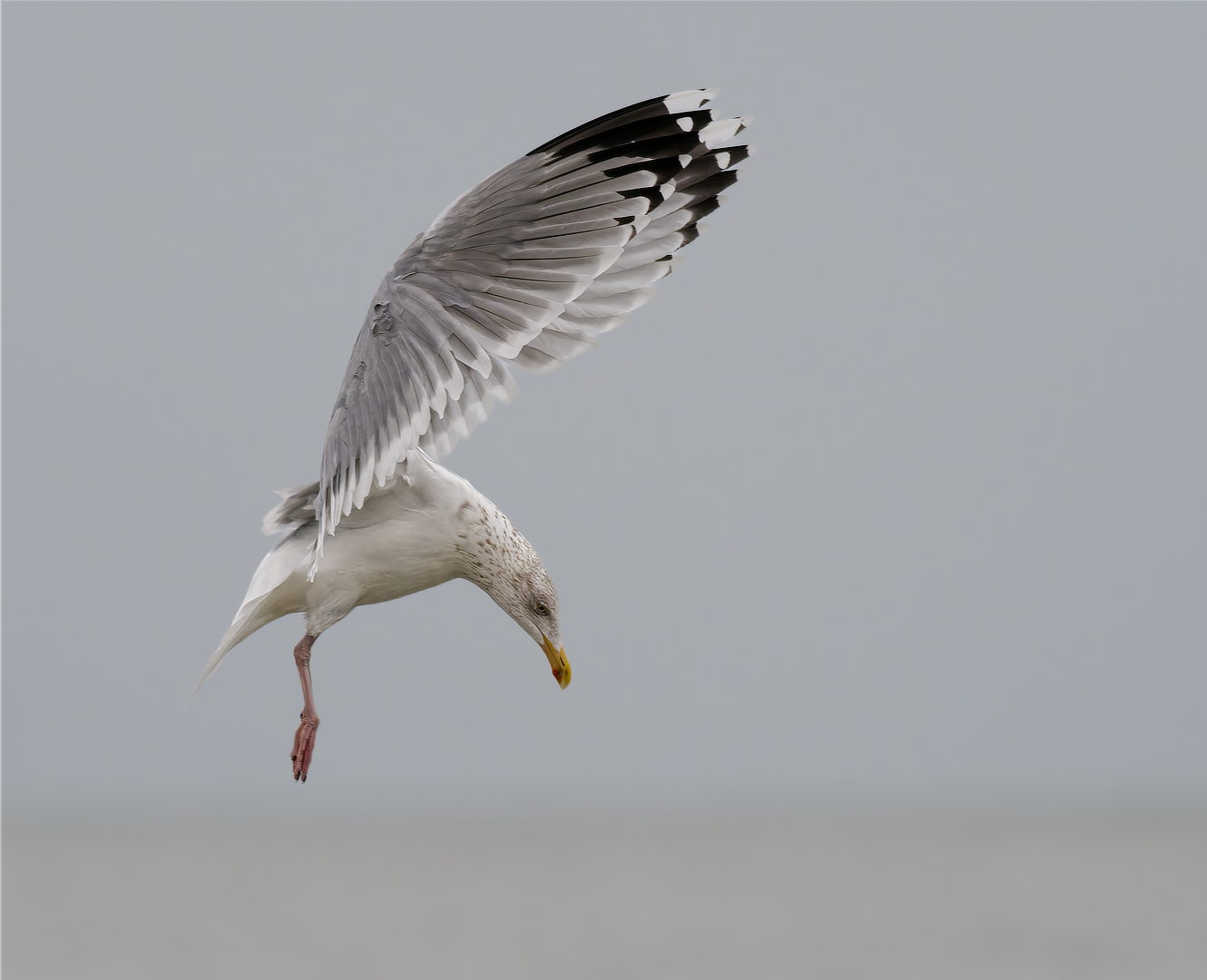 Grijs en donker weer vanochtend. Ik was drieteentjes aan het fotograferen toen deze meeuw even stil bleef hangen boven het water alvorens te landen.