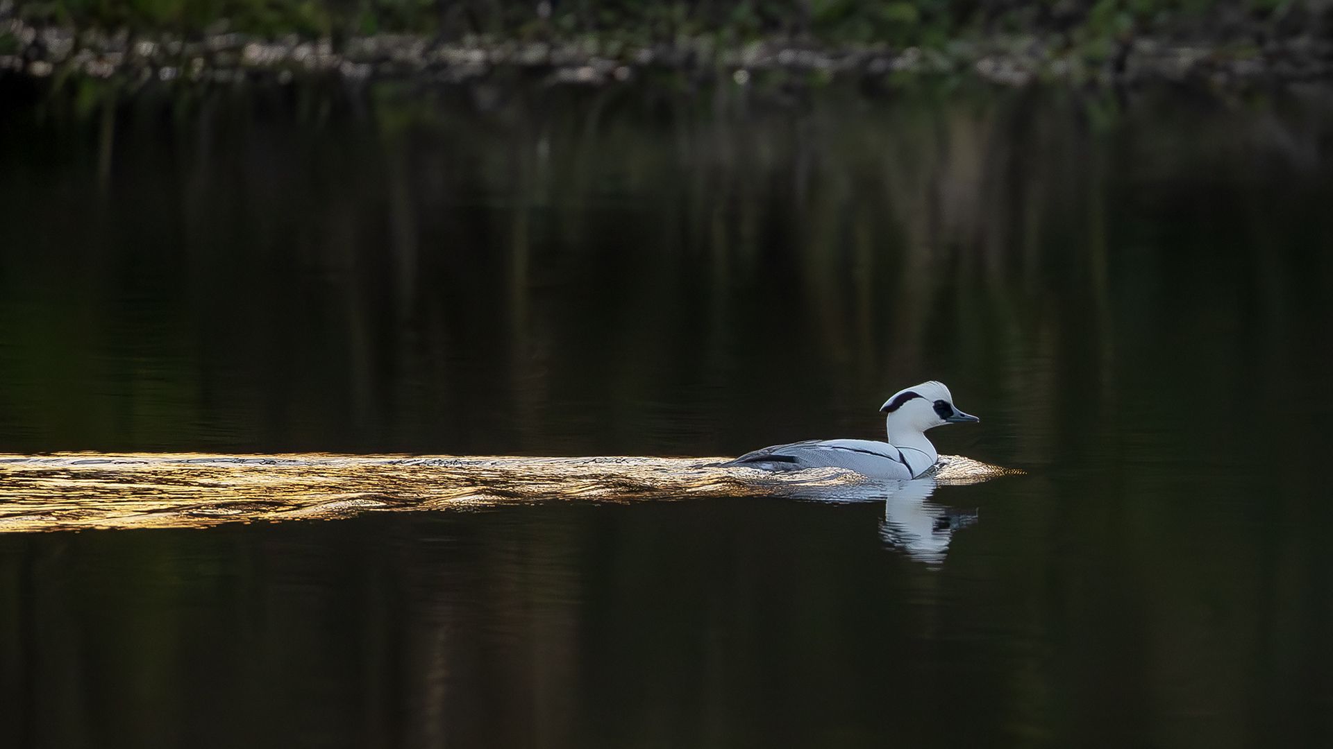 Deze tijdelijke gast zwemt hier al een weekje rond. Foto genomen vanuit de blubber achter een struikje. De lage zon geeft een mooie gouden streep. Het nonnetje zelf houdt blijkbaar van het donker want in de lichtere stukken gaat ie niet zwemmen. Hij gaat dan ook niet zo op in z'n omgeving; je ziet 'm altijd. Over het algemeen een 'witte stip in de verte' want is best schuw.