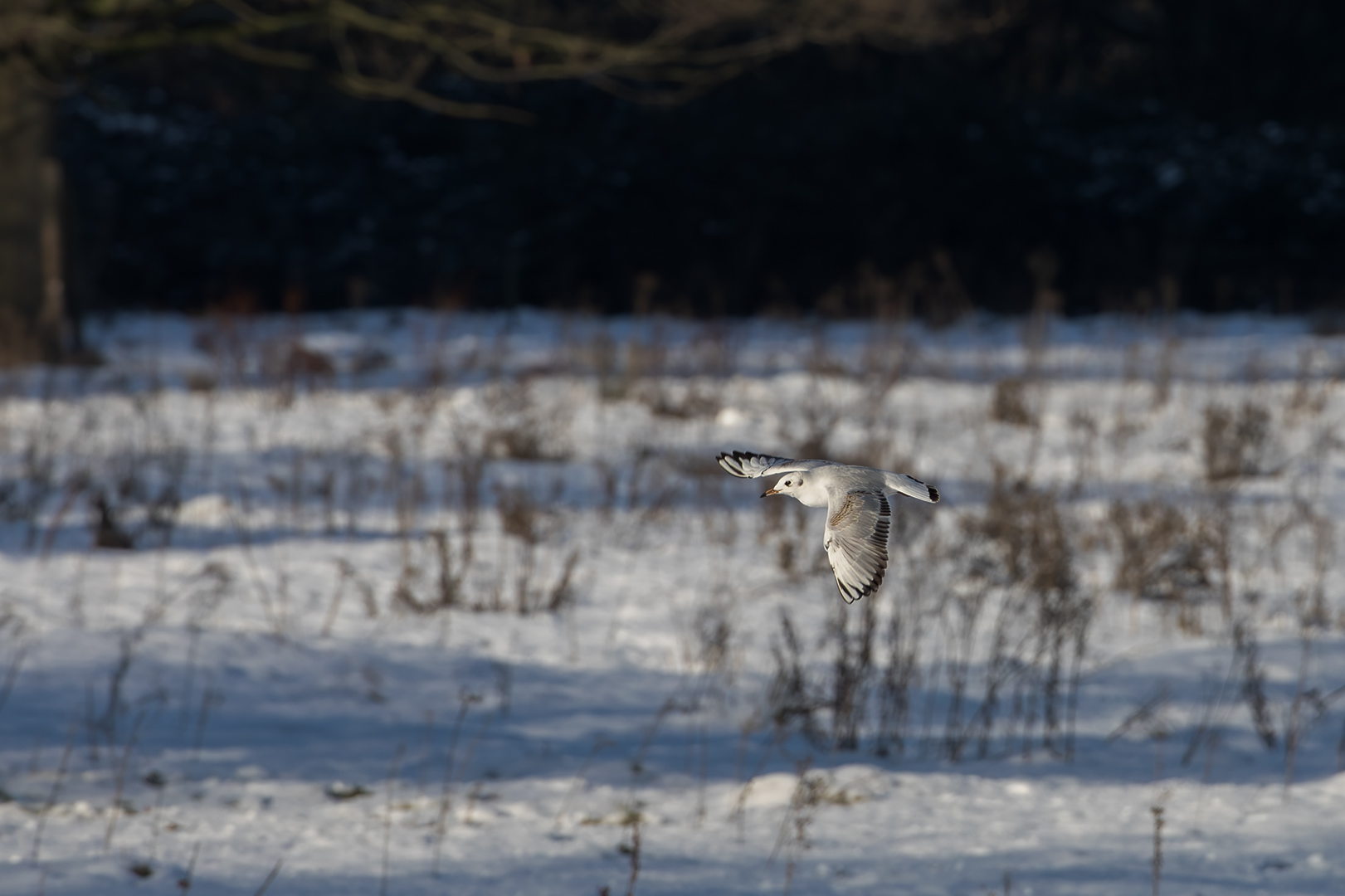 Een wannabe roofvogel? Zo laag vliegend over het weiland? Dit is een kokmeeuw boven het besneeuwde veld. Dacht altijd dat meeuwen wit zijn... maar door al die sneeuw zie je pas goed wat wit is. De meeuw is nu een kleurrijke vogel geworden.