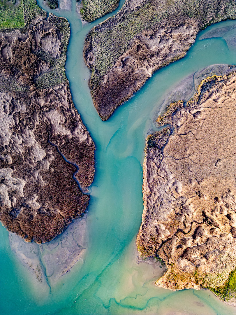 Het blijft een fascinerend gezicht, de scheiding tussen land en water. Dronefotografie.