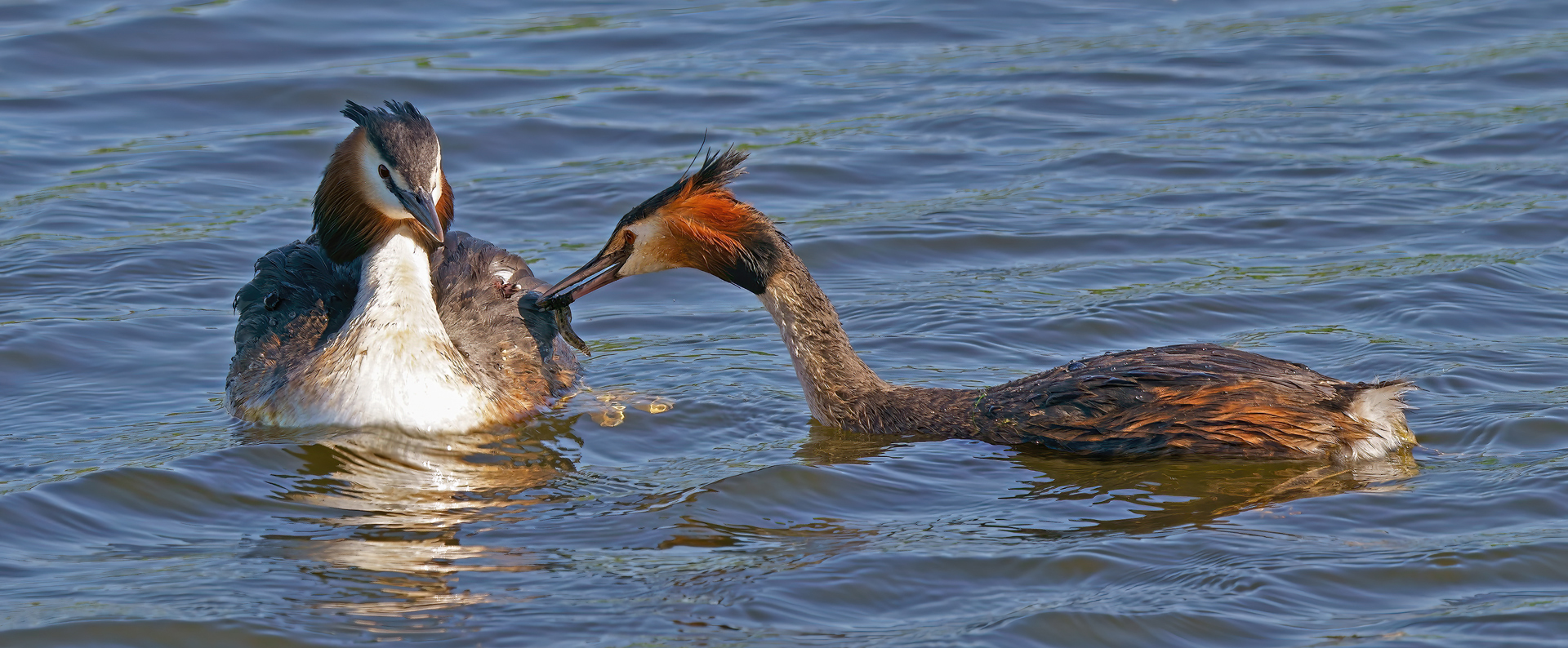 Een beetje verborgen maar nog net zichtbaar het jong op de rug en de rare zwemvliezen.
