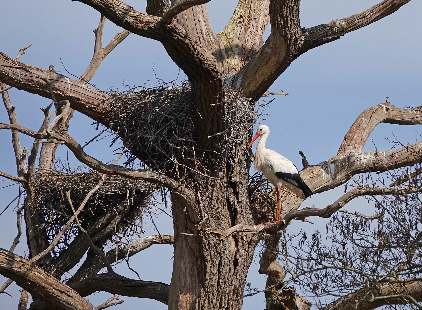 Dit moet een flinke oude boom zijn aan de grootte te zien. Meestal zie je ooievaars niet tussen de boomtakken zitten met hun nest, maar hier hebben ze wel een prima plek. Ondanks het harde zonlicht heb je de contrasten goed onder controle gehouden.
