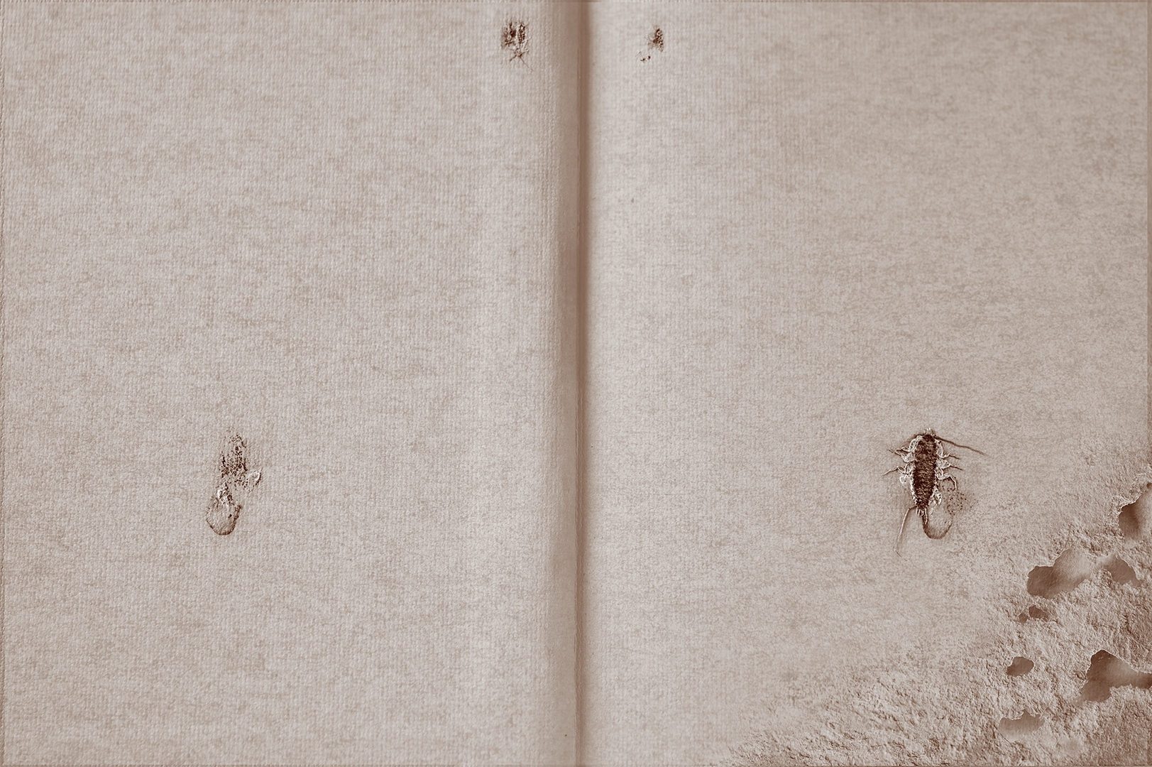 Het was even schrikken toe ik èèn van mijn lievelingsboeken opensloeg en de resten van een papiervisje ( of is het een zilvervisje?) zag. De veroorzaakte schade van deze papierliefhebber viel gelukkig mee , want dit bleef beperkt tot de kaft en eerste pagina. Wel werd een mooie symmetrie achtergelaten. Al met al vind ik het een intrigerend beeld.