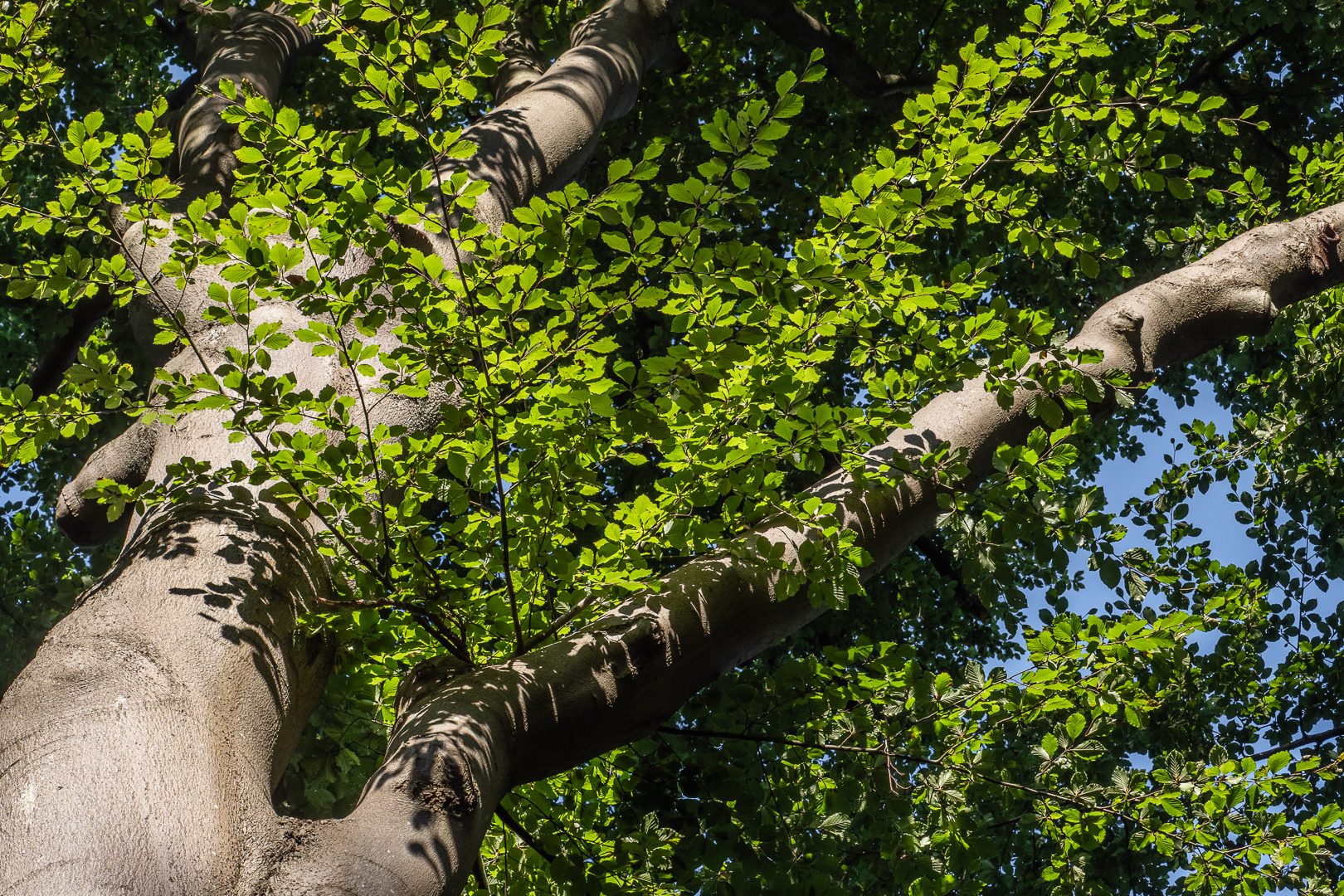 Het felle zonlicht zorgt hier voor veel verschillende tinten groen en schaduw van de bladeren op de boomstam.