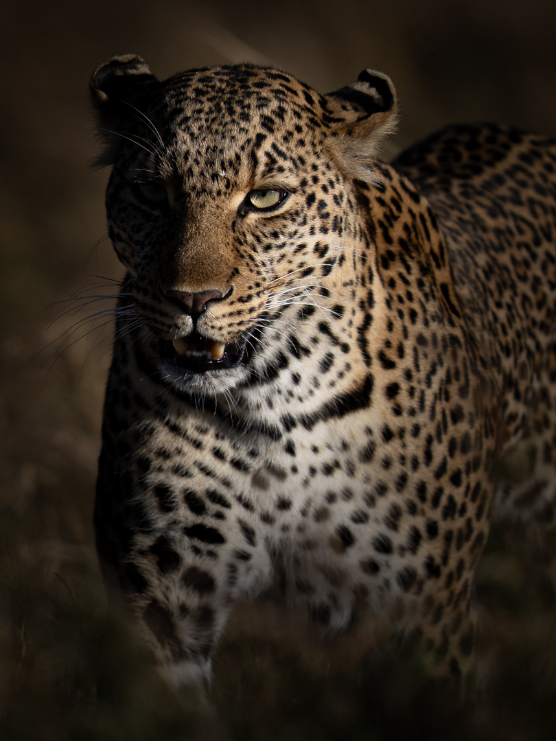 Een luipaard tegenkomen tijdens safari, blijft indrukwekkend. Door de bijzondere lichtval en de uitsnede krijgt deze grote kat een mysterieus karakter.