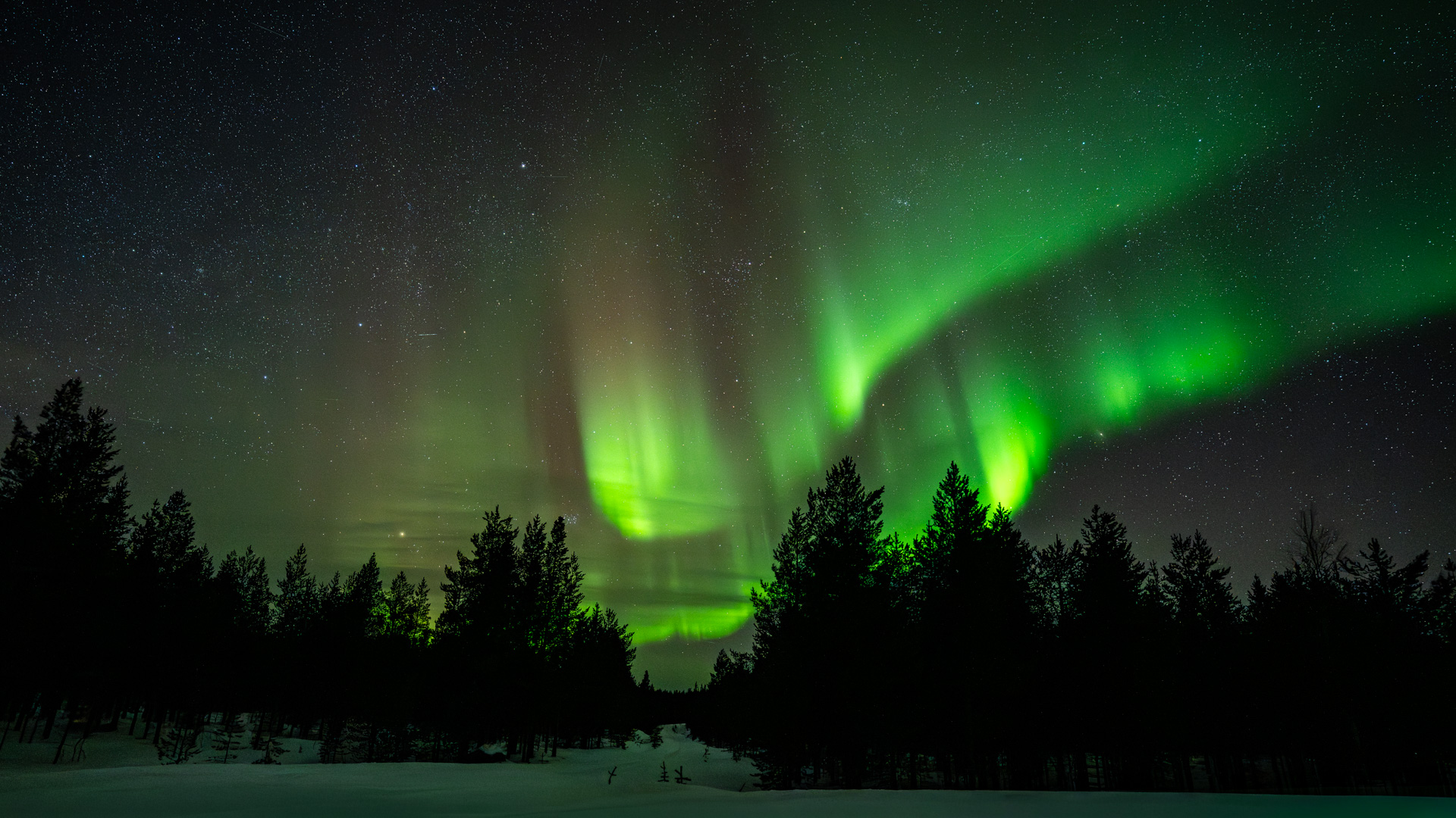 Ook deze noorderlichtplaat is prima gelukt. De dubbele boog noorderlicht begint in de ruimte tussen de twee bomenrijen en de bomenrijen vormen een interessant silhouet. De onderste rand sneeuw vertelt nog even dat het echt winter is.
