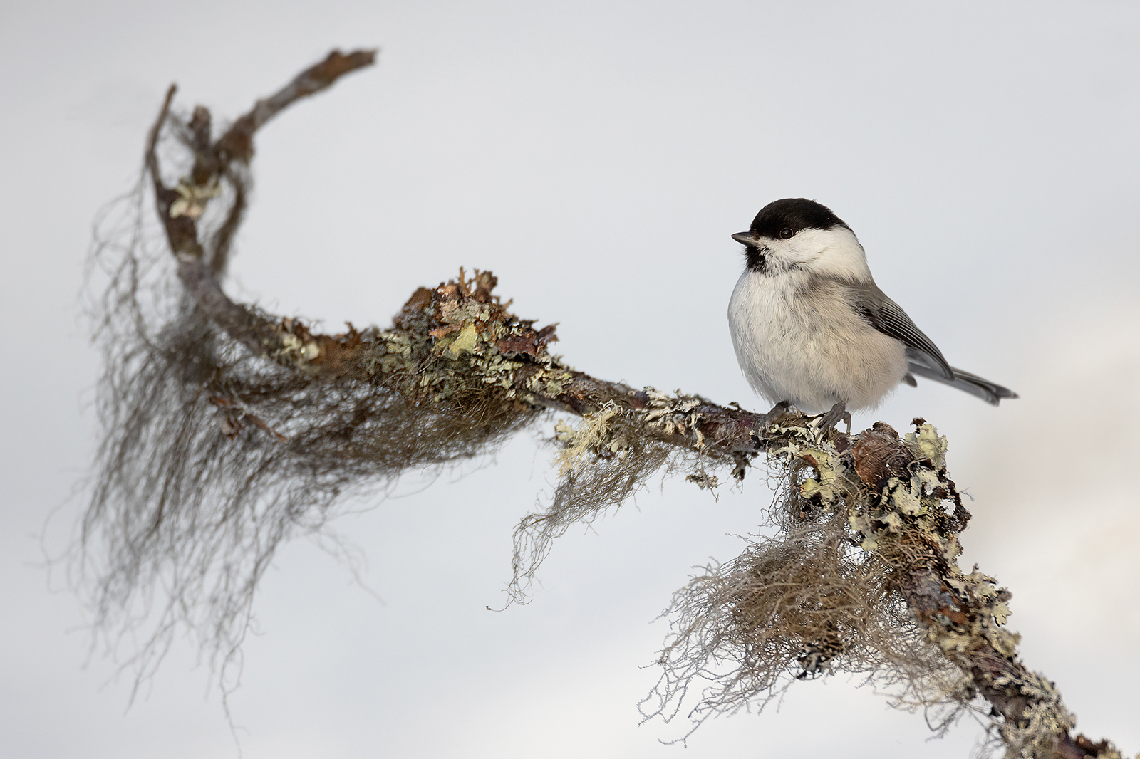 De vorm van de tak en de besneeuwde achtergrond leende hem om deze matkop wat ruimer weer te geven.