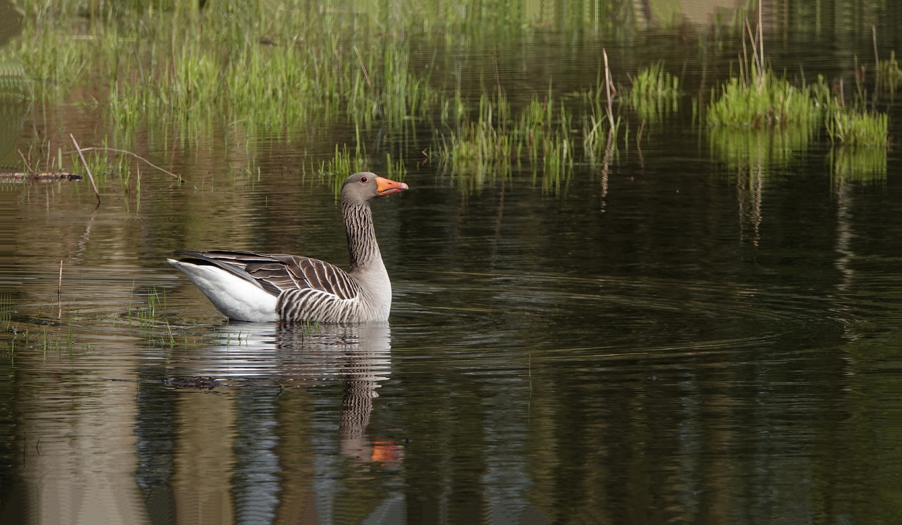 Deze Grauwe Gans zwom fier in het water alsof het wilde zeggen; kijk mij eens, ben ik niet mooi?
