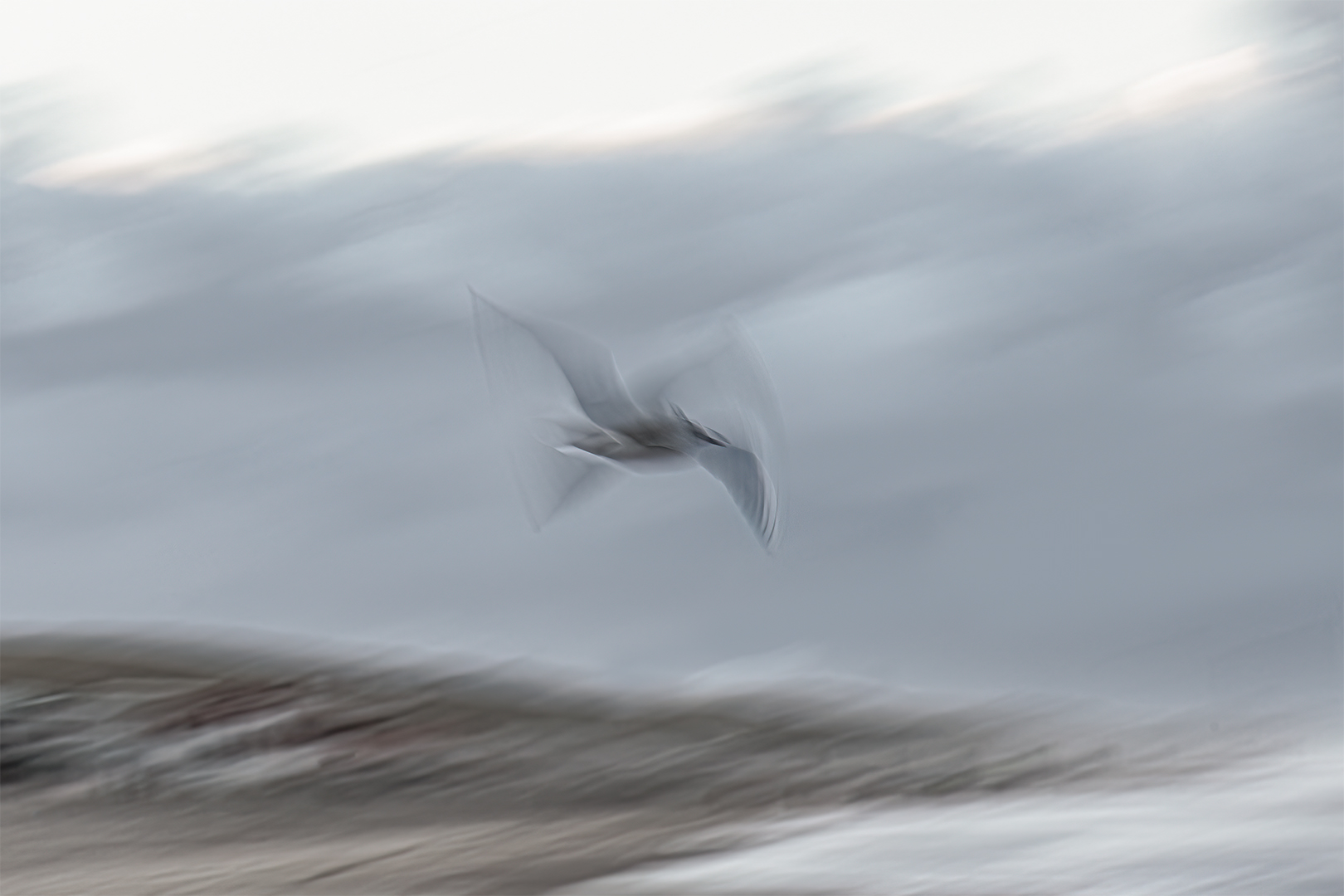 De vormen die ontstaan door de beweging van de vleugels vind ik in dit soort foto’s altijd boeiend. De omgeving heeft een kleurenpalet dat prima bij de vogel past en leuke (net nog herkenbare) vormen. Alleen het lichte deel bovenin trekt wat aandacht maar zonder dat deel vind ik de foto wat saai worden. Missie geslaagd zou ik zeggen en koude vingers kun je gelukkig weer opwarmen.