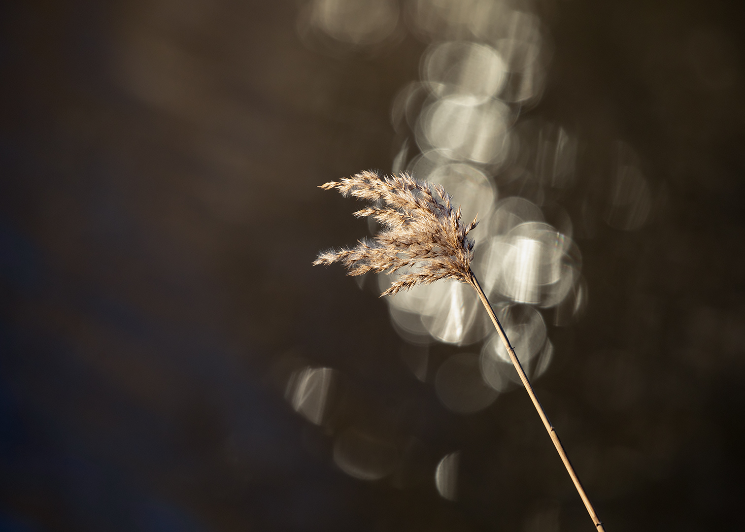 Het riet langs de waterranden wordt hier in de stad altijd platgemaaid bij einde seizoen. Tenzij je net te klein bent. Deze eenzame stengel was te kort om geraakt te worden en dankzij het milde weer kreeg het alsnog de gelegenheid groot te groeien. Helemaal alleen langs het water in de zon; diezelfde zon scheen ook op een raam van een flat 50m verderop en weerspiegelde in het water achter de rietstengel.