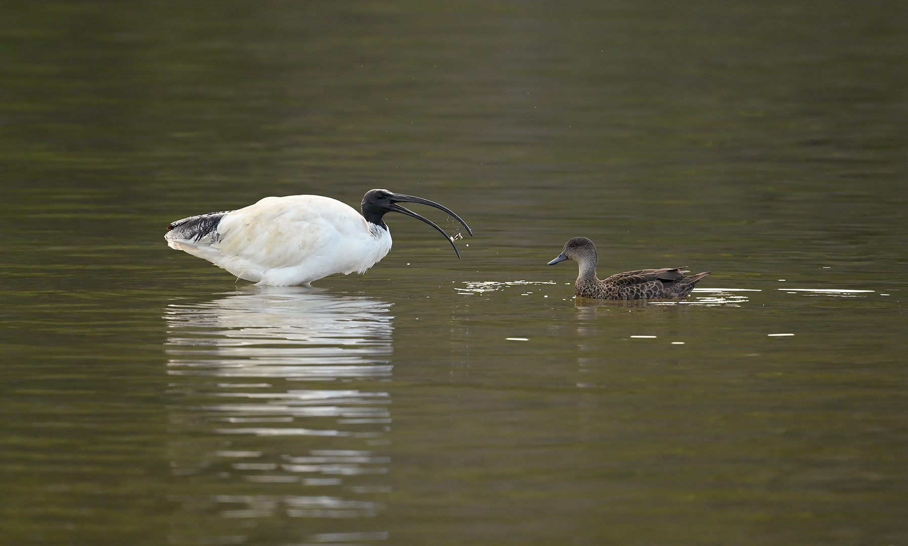 Een Australische ibis was aan het jagen op kleine visjes wat de dame kastanje taling dan we weer interessant vond en een tijdje hinderlijk rond de ibis zwom