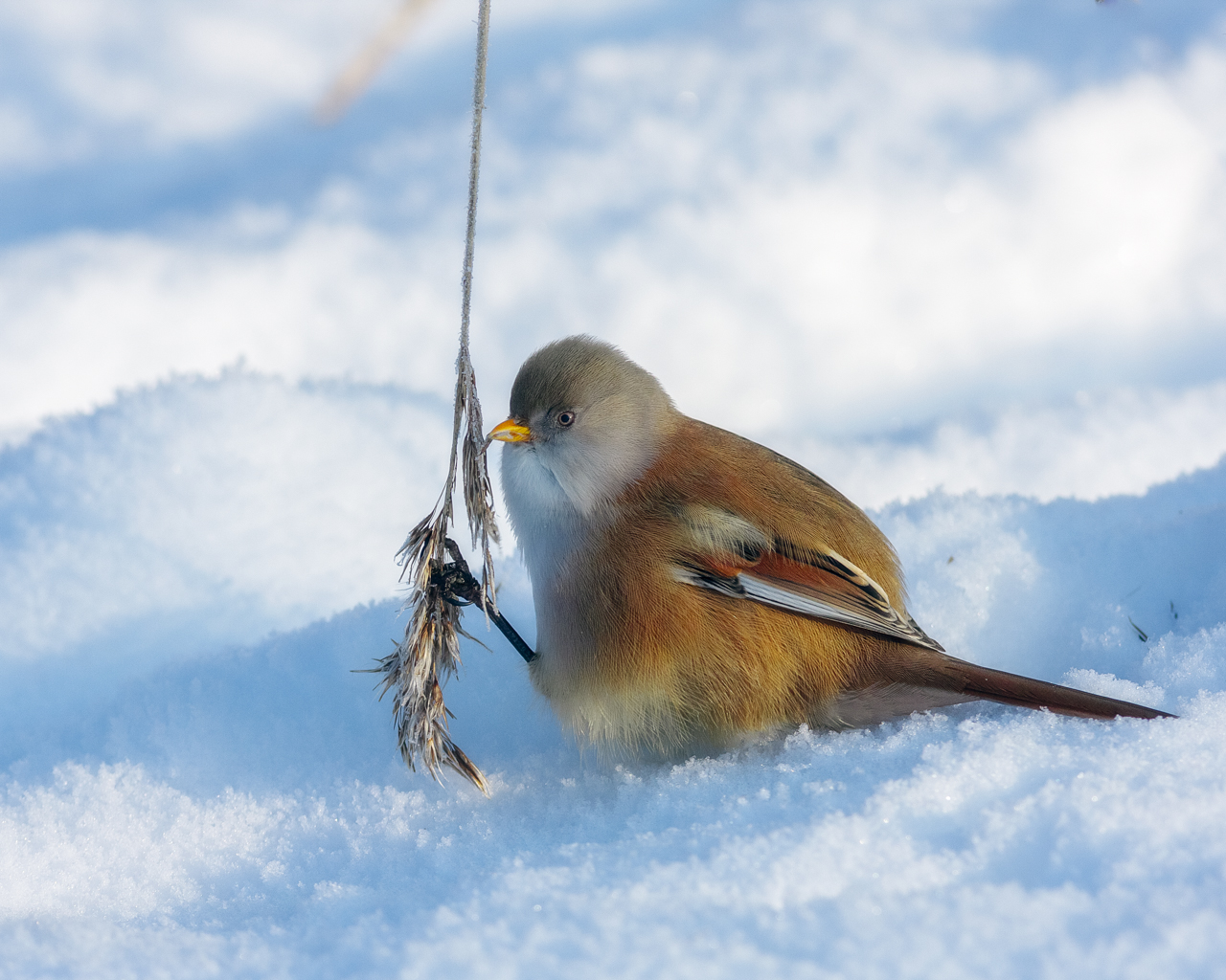 Wat een mooie pose heb je hier te pakken Rob. Een baardmannetje in de sneeuw, wat wil je nog meer hebben! De schaduwen zijn wat blauw, maar zullen ongetwijfeld een reflectie van de lucht weergeven. Het geeft het beeld ook wel lekker wat koels mee. Heel fraai van scherpte op kop en verenpak. Heb je nog overwogen om dat vage oranje streepje (riet?) bovenin weg te poetsen?