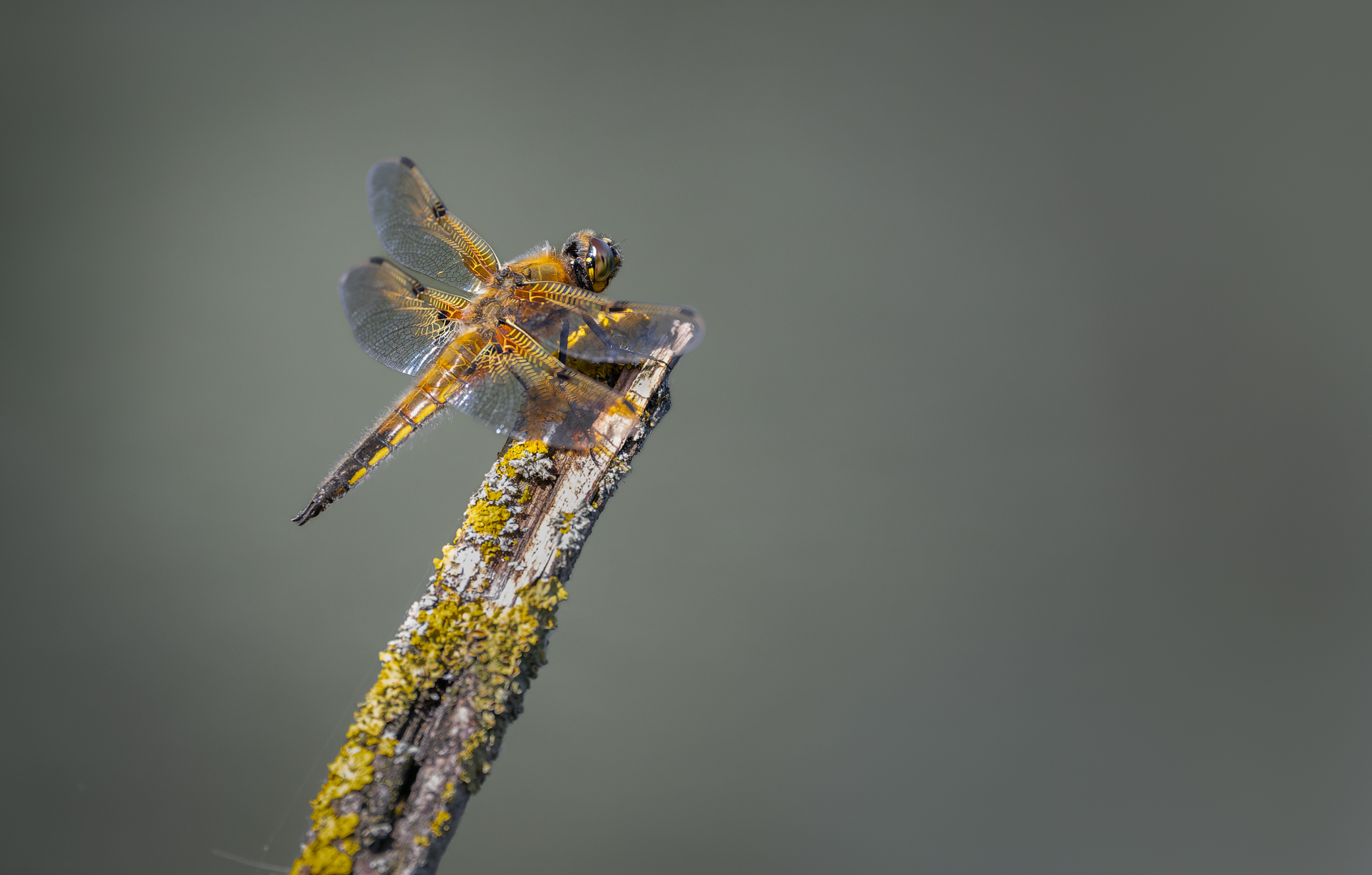 Mooi hoe het goudgeel van de libel en de mossen met elkaar matchen, tegen het stemmige grijs van de achtergrond komt die kleur ook heel mooi tot zijn recht, Fijne plaat Piet!