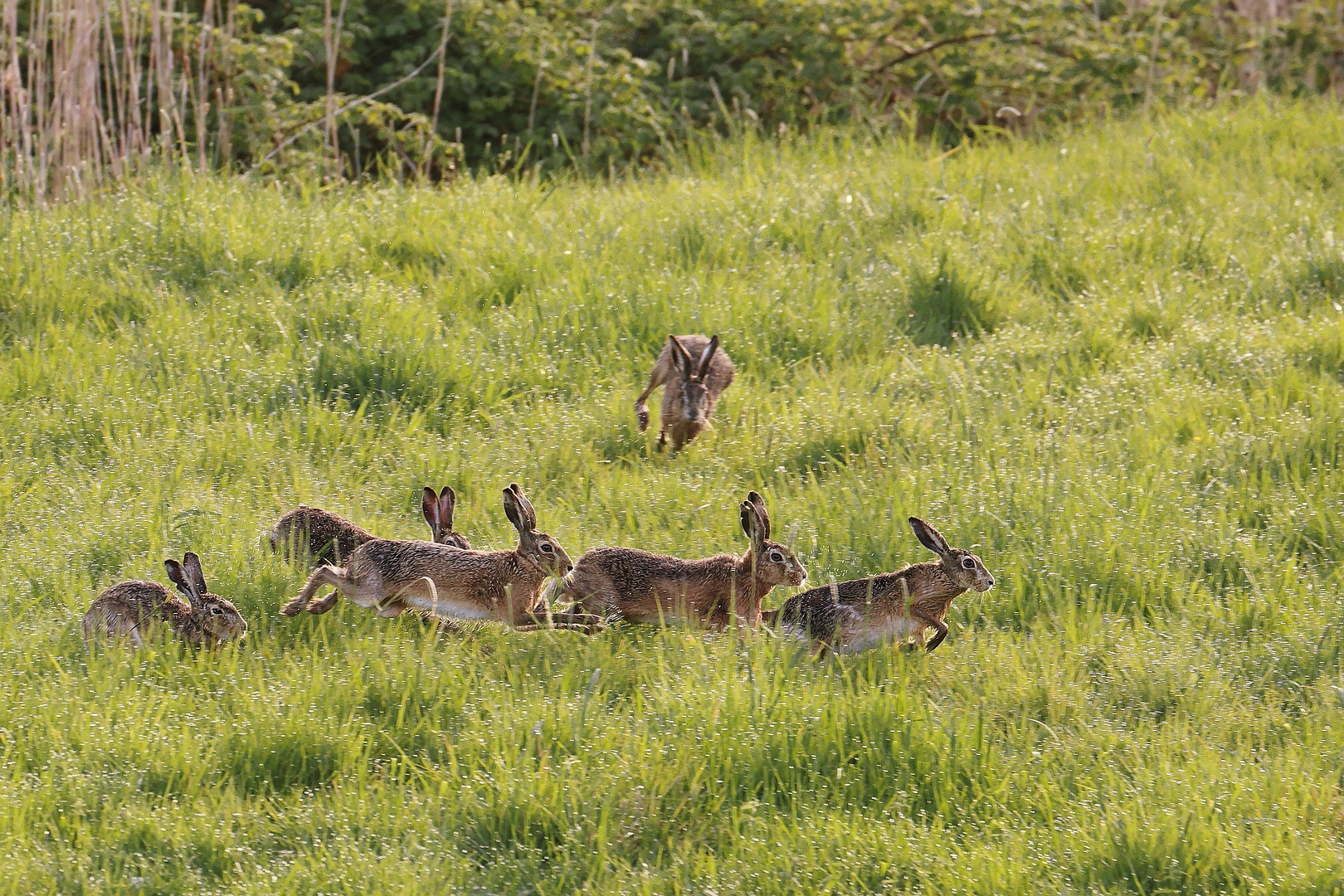 Gaaf actiemoment van dit 'treintje' hazen, in het ideale geval zou je de aankomende haas in het midden ook scherp willen hebben, maar dat is nu eenmaal vrijwel onmogelijk.
