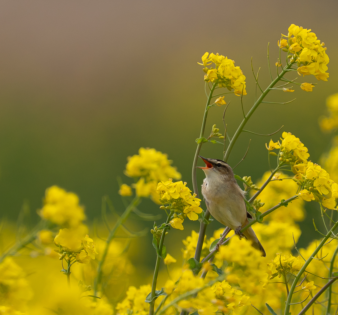 Normaal gesproken zie je rietzangers tussen het riet maar deze vloog steeds op en neer tussen het raapzaad.