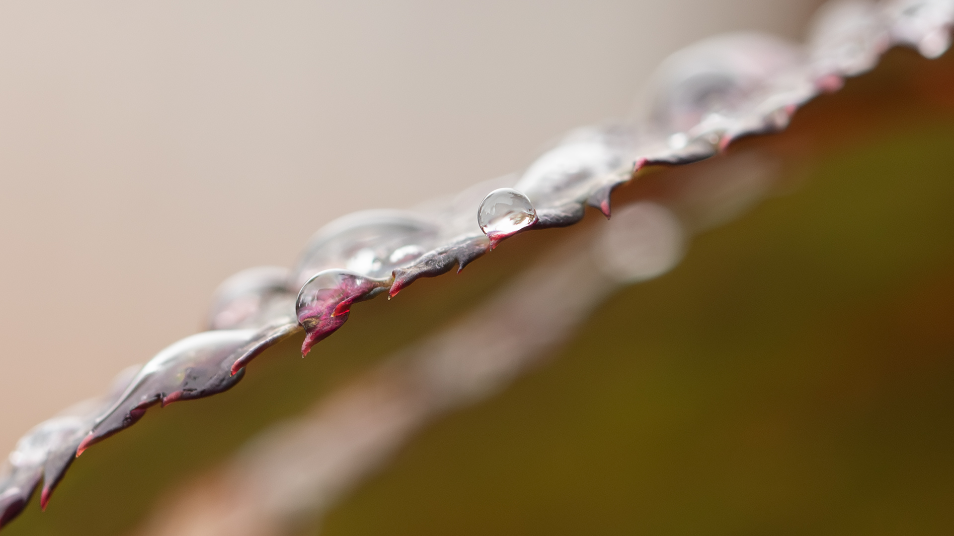 In de druppels regen op het rozenblaadje staan 2 bergen; een rode en een witte. Voor mij opvallend zijn de rode punten aan de blaadjes; die zie je alleen als ze nog jong zijn. Uiteindelijk worden ze donkergroen en kun je ze niet meer aanraken omdat ze erg scherp worden.