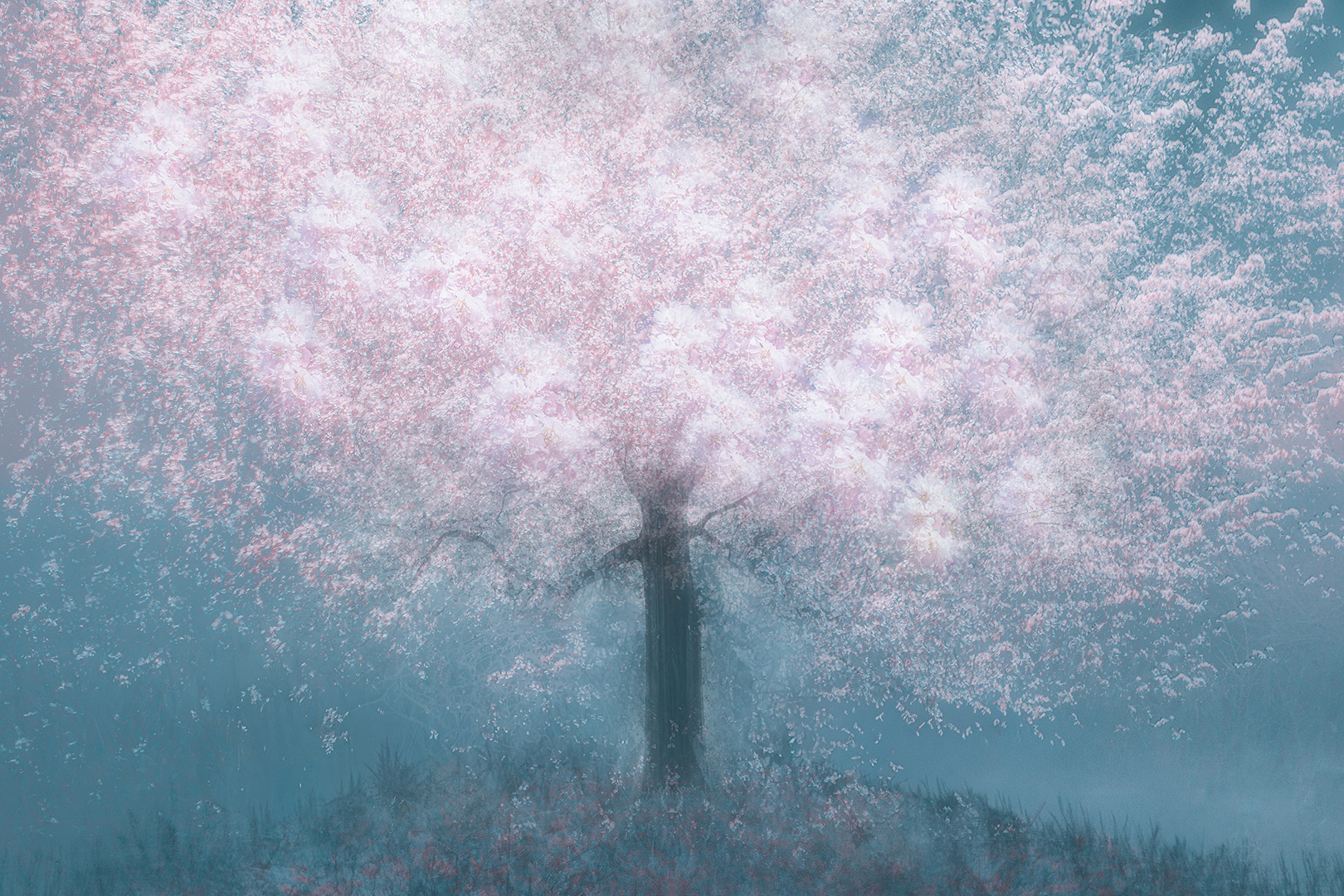 Het is weer een sprookje. Het blauw van de achtergrond vormt een perfect contrast met de roze bloesem. Dromerig beschrijft het beeld denk ik prima. Het verloop van vol roze naar steeds meer blauw met kleine roze kleurvlekken vind ik heel goed gelukt.