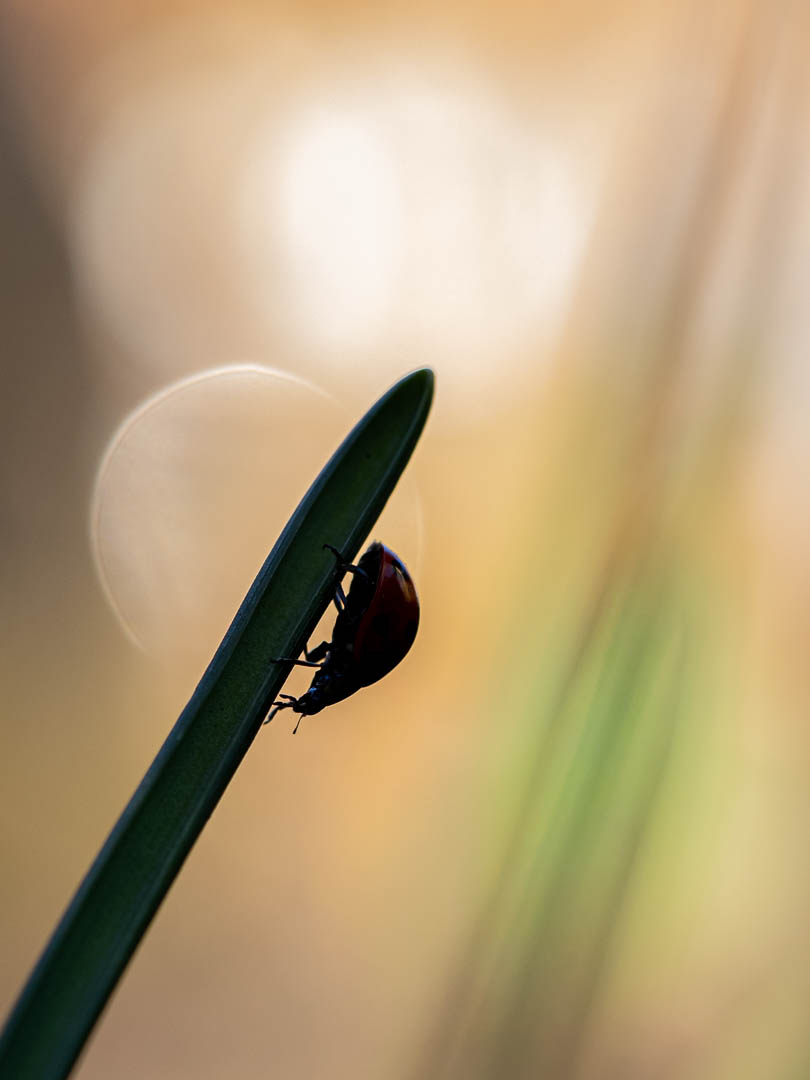 Door flink onder te belichten op het lieveheersbeestje in de schaduw werd de achtergrond in de zon niet overbelicht.