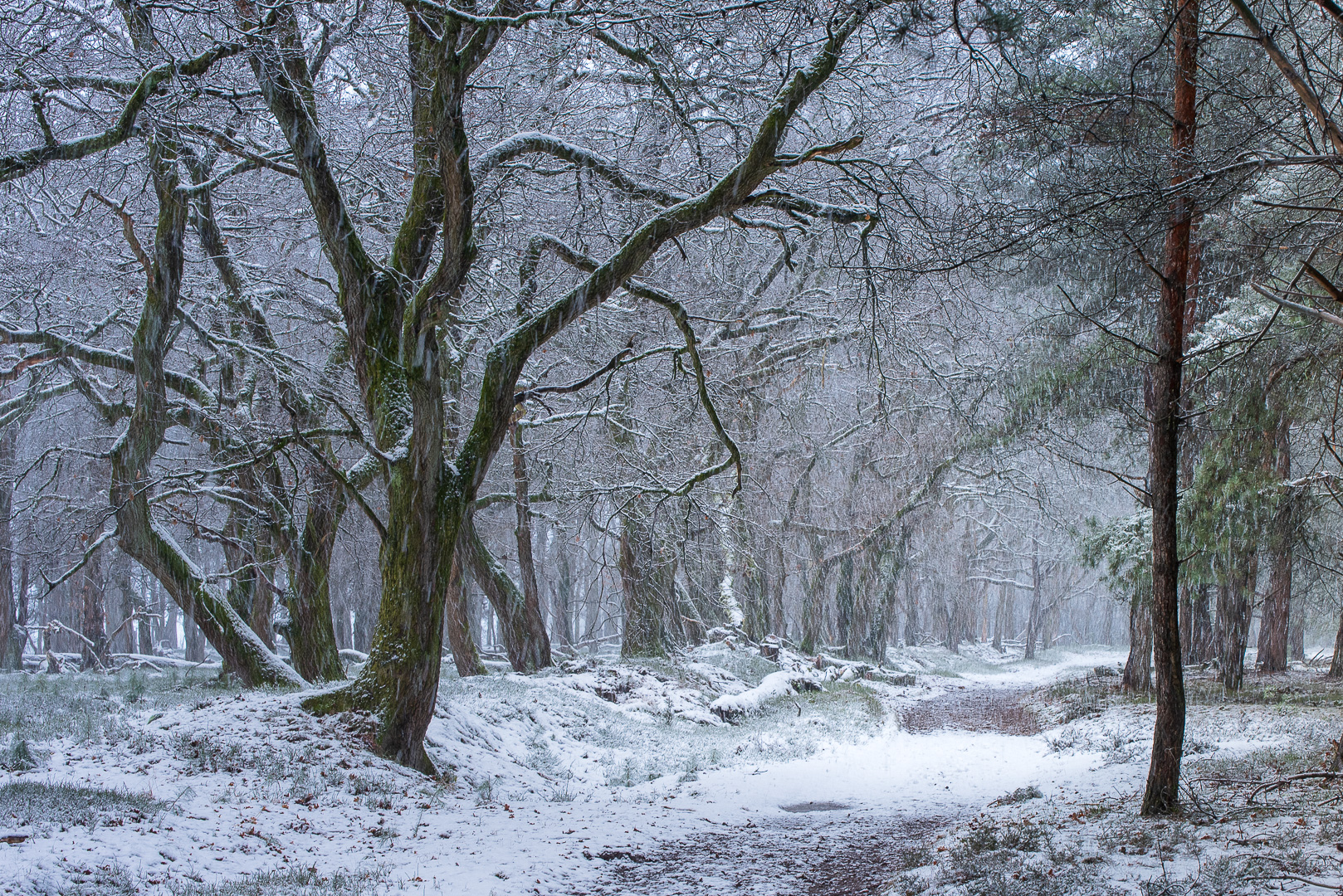 Dit vindt ik altijd een prachtig stukje bos, een heleboel kronkelende zomereiken, maar ook lastig te fotograferen (staan dicht bij elkaar). Bij deze opname de voorste groots in beeld gezet, waardoor de anderen op de achtergrond mooi mee kunnen spelen.