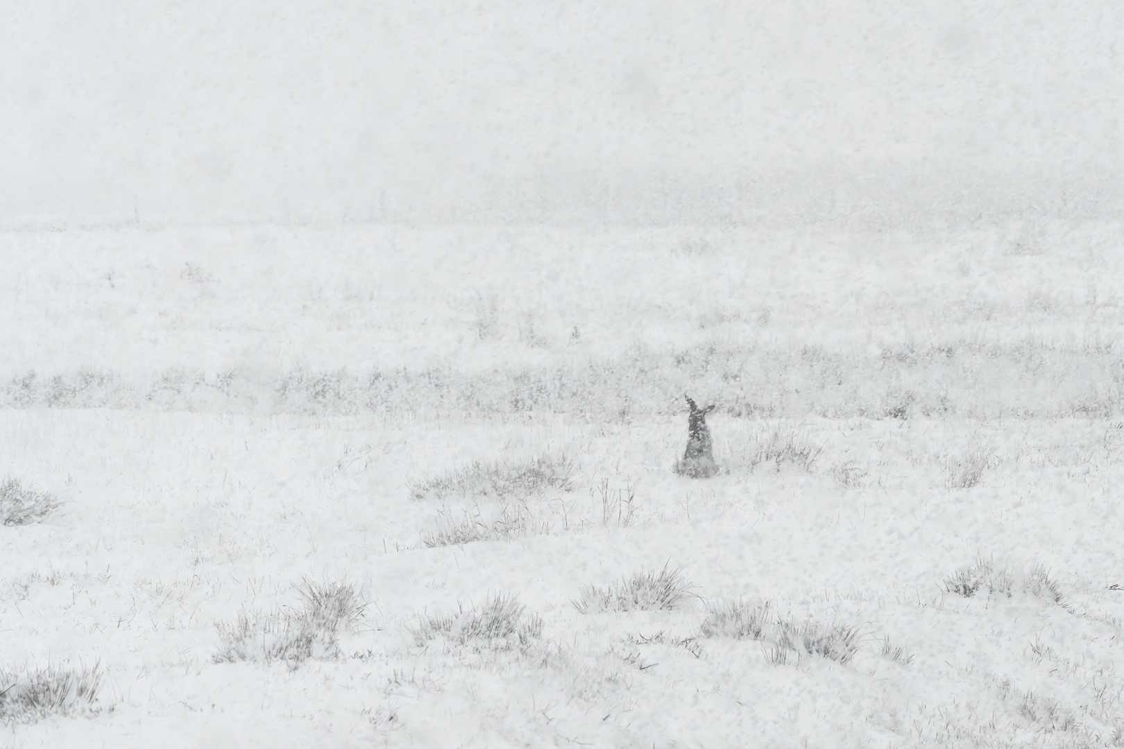 Een minimalistisch beeld van een konijntje in de sneeuw.