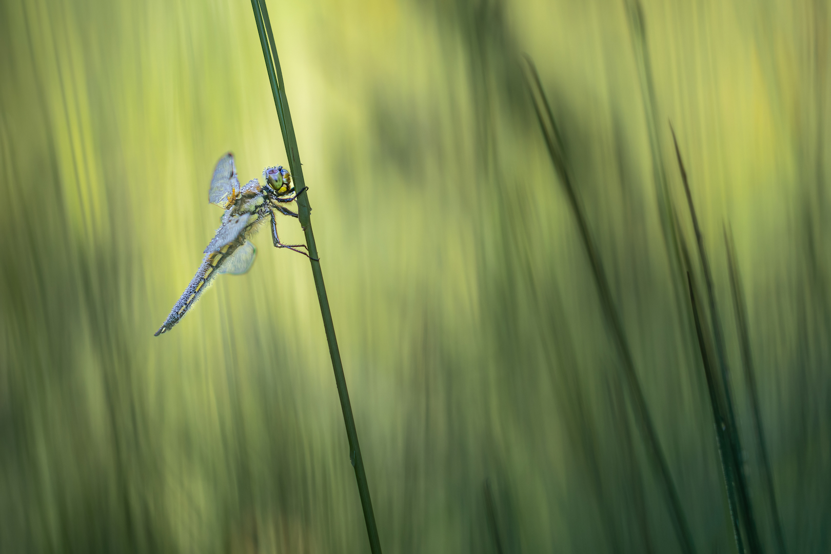 Mooie beeld gecreëerd Arjo. Kan er helemaal inkomen, lekker vroeg in het veld en doen wat je leuk vind, Mooie opname van de bedauwde libel, scherpte op de kop ziet er goed uit. Fraaie compositie, de libel in een stukje leefgebied waar hij of zij de nacht heeft door gebracht. Het licht levert een mooie bijdrage in je achtergrond. Als je met zulke beelden thuis komt is dat het vroege opstaan meer dan waard.