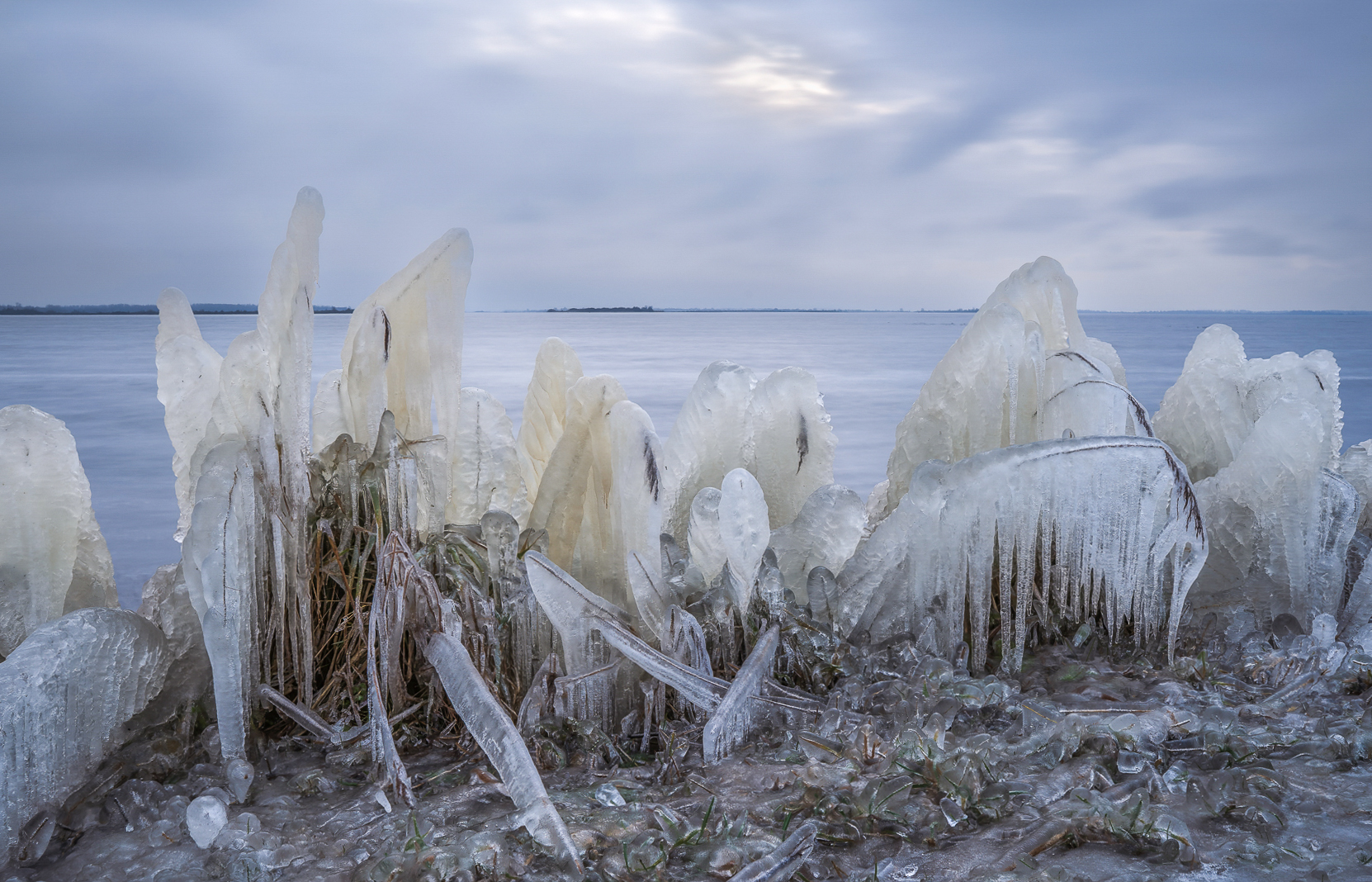 Het was een spectaculair gezicht. Door de harde wind was het riet aan de oevers van het Lauwersmeer helemaal bedekt met ijs in mooie grillige vormen. Ik heb de foto opgefrist.