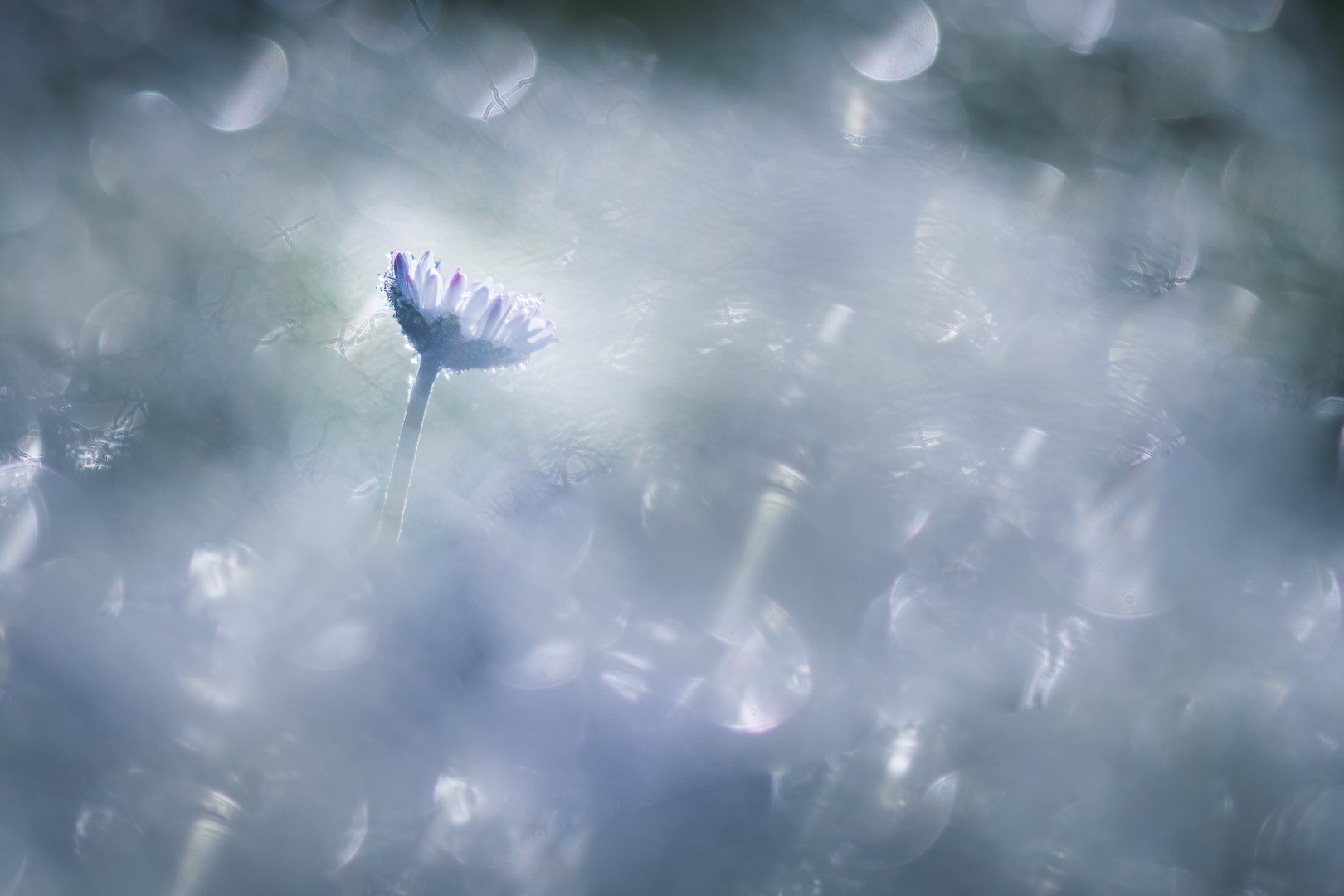 Dit madeliefje trok mijn aandacht tussen het gras, helemaal verscholen en een beetje bedekt met rijp. Ik gebruikte glinsterende draadjes uit de box met kerstversiering om de sfeer van het moment te accentueren.