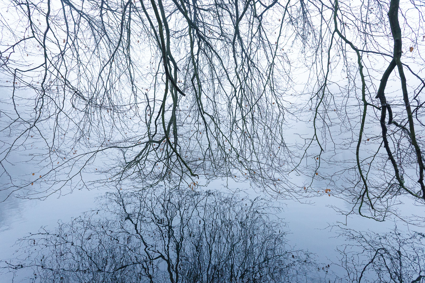 De hangende takken werden mooi gereflecteerd in het water. De mist zorgde er die ochtend voor dat de achtergrond verhult werd. Genomen met 17 mm op F8
