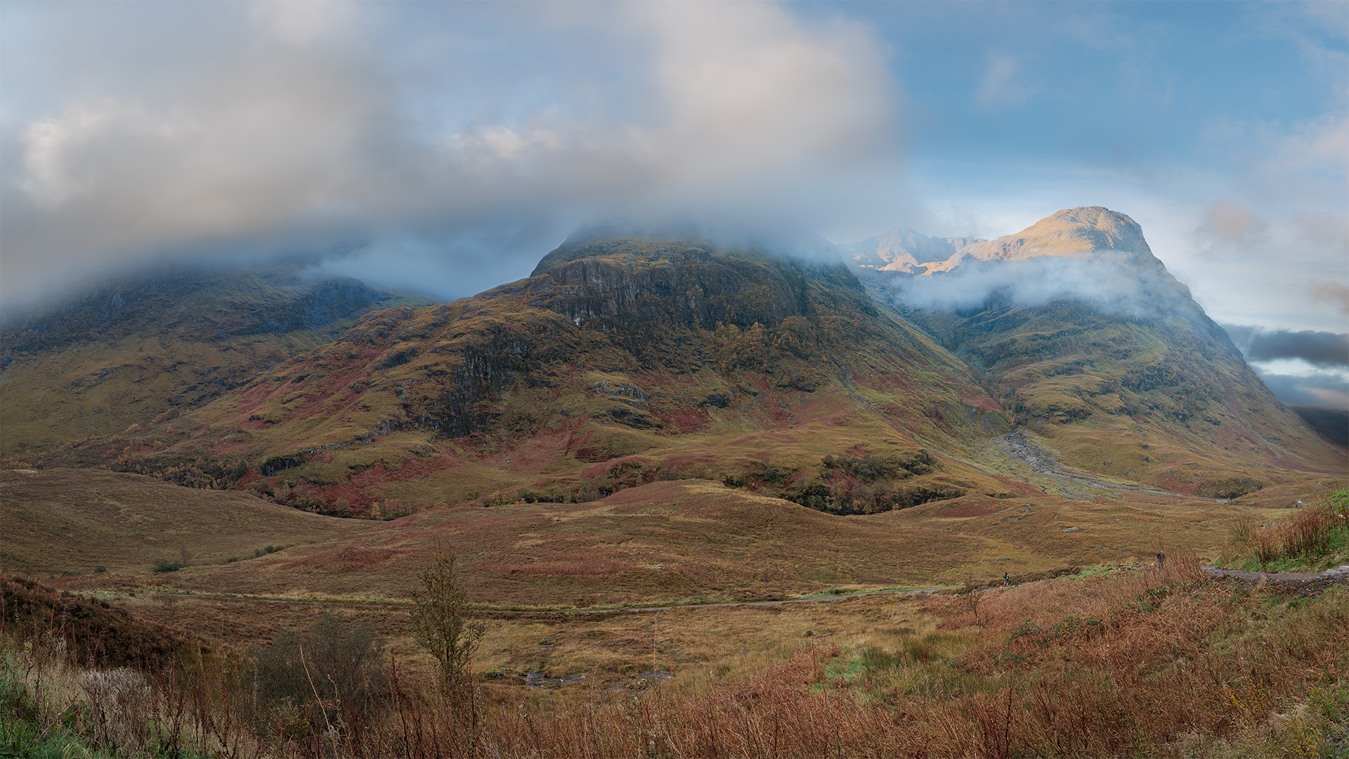 In Glen Coe ligt de richel Aonach Eagach en drie markante heuvels die men de Three Sisters of Glen Coe noemt (Nederlands: Drie Gezusters van Glen Coe). De drie bergen zijn: Beinn Fhada, Gearr Aonach en de Aonach Dubh, alle drie toppen van Stob Coire nan Lochan. Allemaal uitlopers van Bidean nam Bian (een groot berggebied met 20 km aan berggraten met veel subtoppen). Langs de weg door het dal is een parkeerplaats waar je goed zicht hebt op de drie heuvels. Deze ochtend was het licht licht prachtig met wat nevel en wolken. Het dynamisch bereik van een moderne camera is groot, met dit was way to much. Dus 2 panorama's van elk 6 foto's. Eentje voor de bergen en landschap en eentje voor de lucht en wolken. In de nabewerking samengevoegd met behulp van Luminocity masks (Helderheidmaskers) van TK (Tony Kuyer) daar ik geen fan ben van HDR en dat vaak nepperig vindt. Veel werk, maar het resultaat ben ik blij mee.