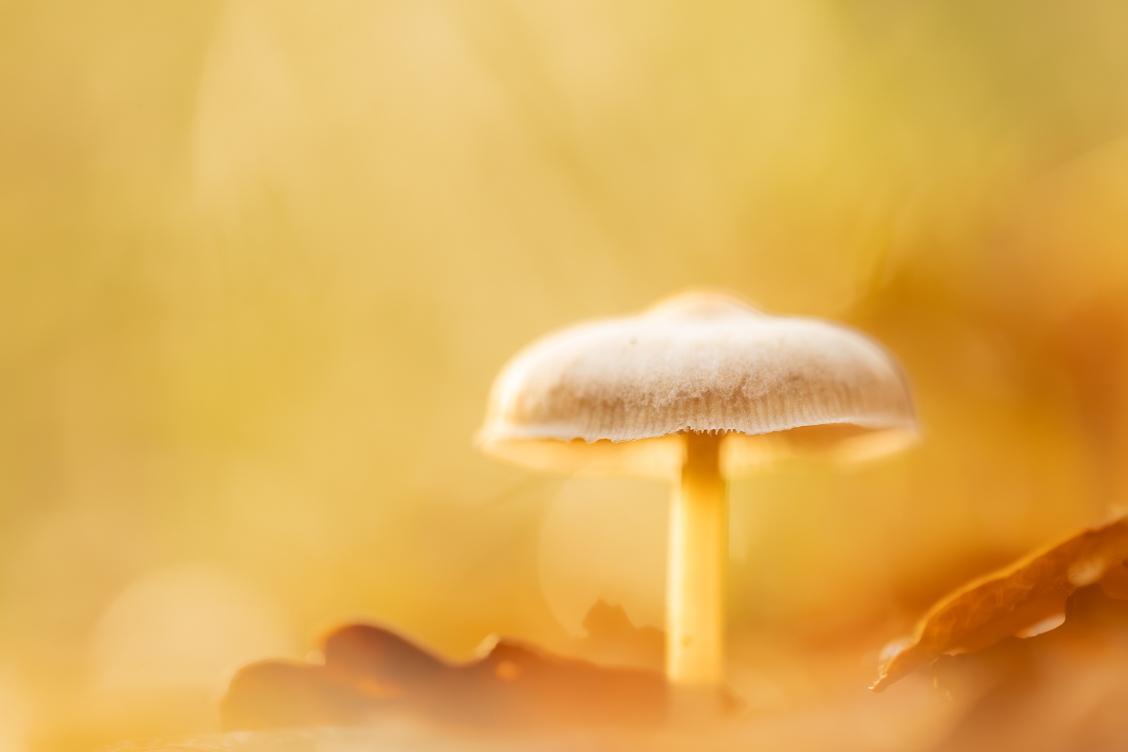 Macro-opname van een klein paddenstoeltje tussen herfstblad. En ik hoop dat hij nu wel goed scherp is op de rand van de hoed.
