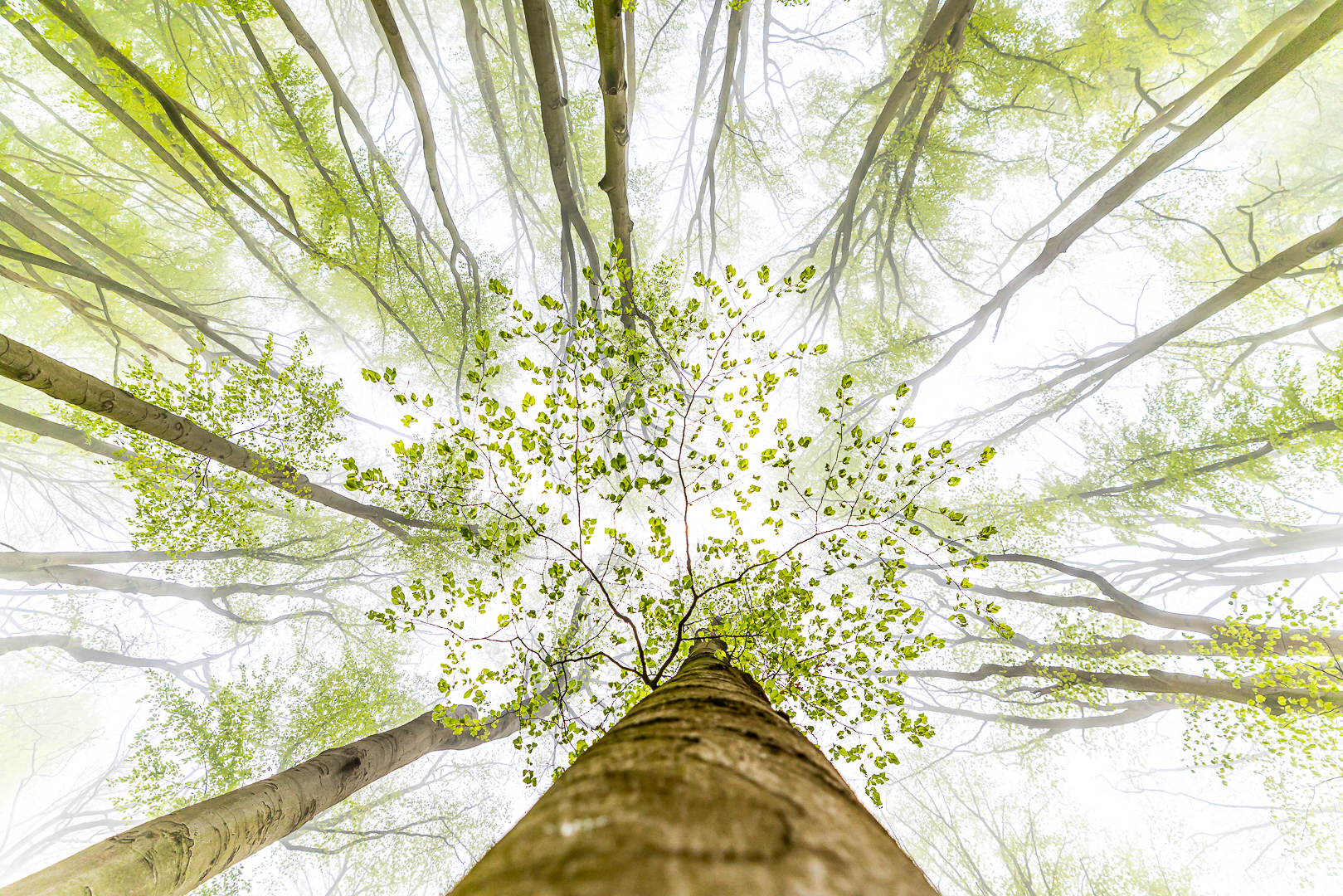 Mist in het beukenbos komt in het voorjaar, als de kleuren groen op z'n mooist zijn, niet vaak voor. Gelukkig heb ik een beukenbos op fietsafstand en was ik, de mistverwachting in het oog houdend, op het juiste moment ter plekke. Je maakt dan allerlei soorten beelden, van 15 mm groothoek tot 500 mm tele. Door ongebruikelijke standpunten op te zoeken kun je ook nog meer grafische beelden maken. De mist maakt dan alles nog meer mystiek.
