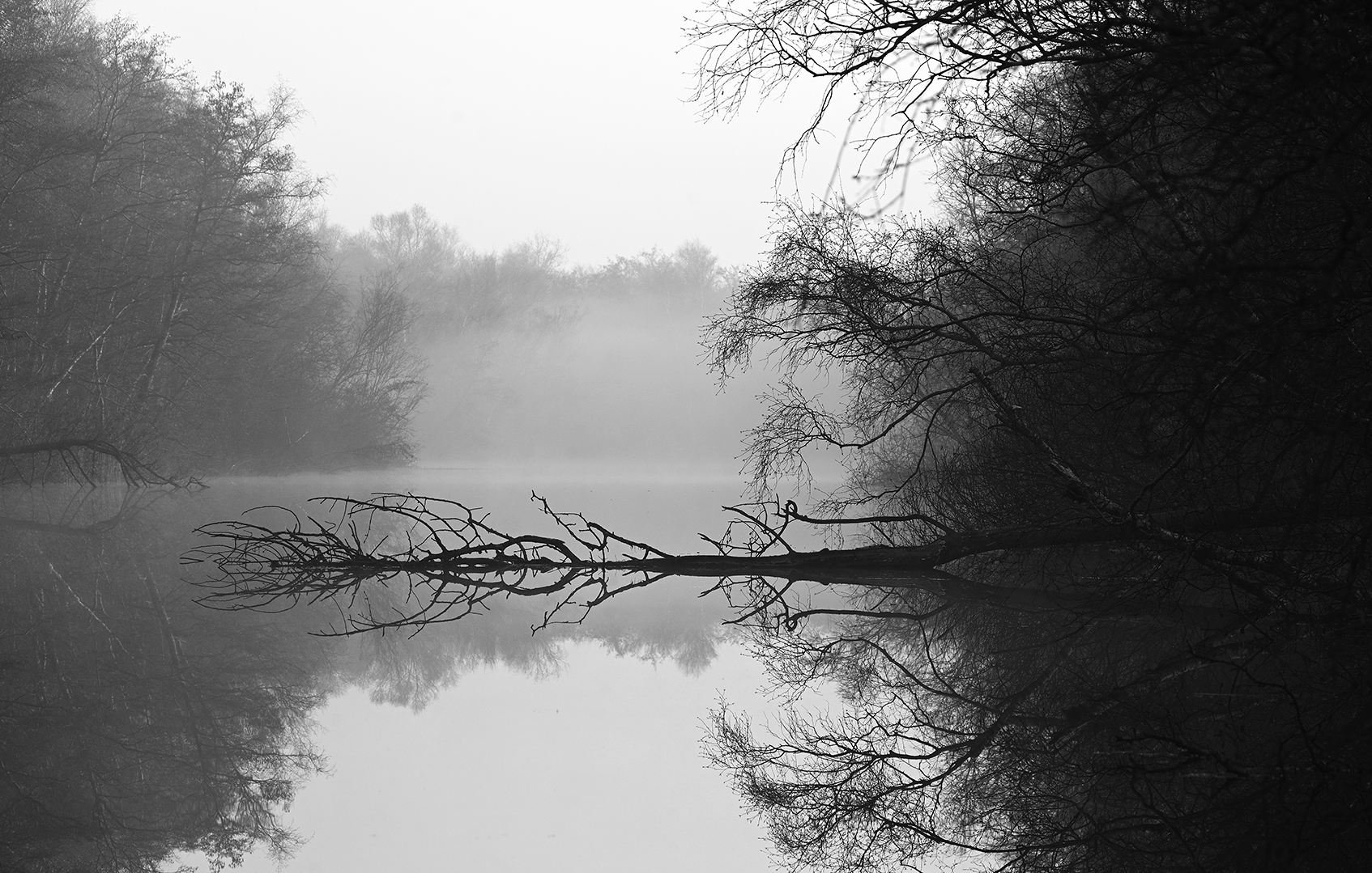 Een sereen en sfeervol beeld dat door de beide oevers en de mist veel diepte krijgt. De sfeer is voor mij, mogelijk door de zwart wit omzetting, vrij somber.