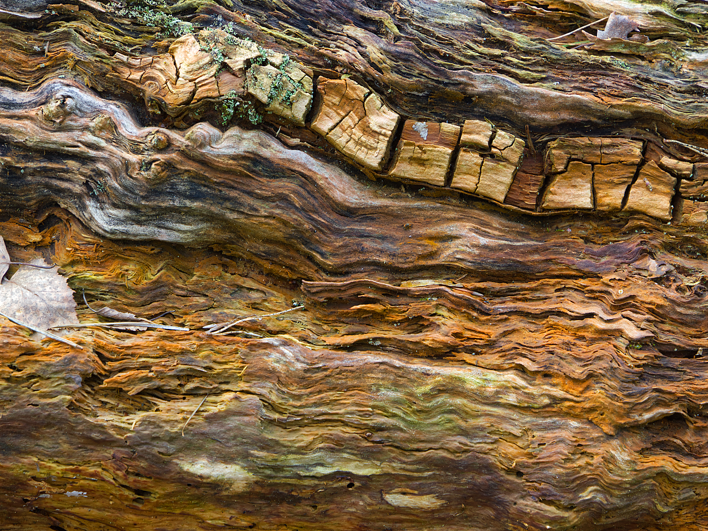 Deze boomstam ligt al jaren te vergaan maar na een regenbui komen er mooie kleurtinten te voor schijn.