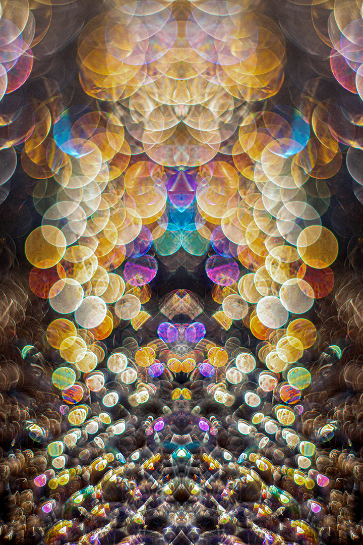 Kleurrijke bokehbolletjes van zeeschuim op het strand. Gemaakt met Helios lensje en tussenringen. Kaleidoscooppatroon resultaat van lagen in PS. De kleuren zijn aangepast in Camera Raw.
