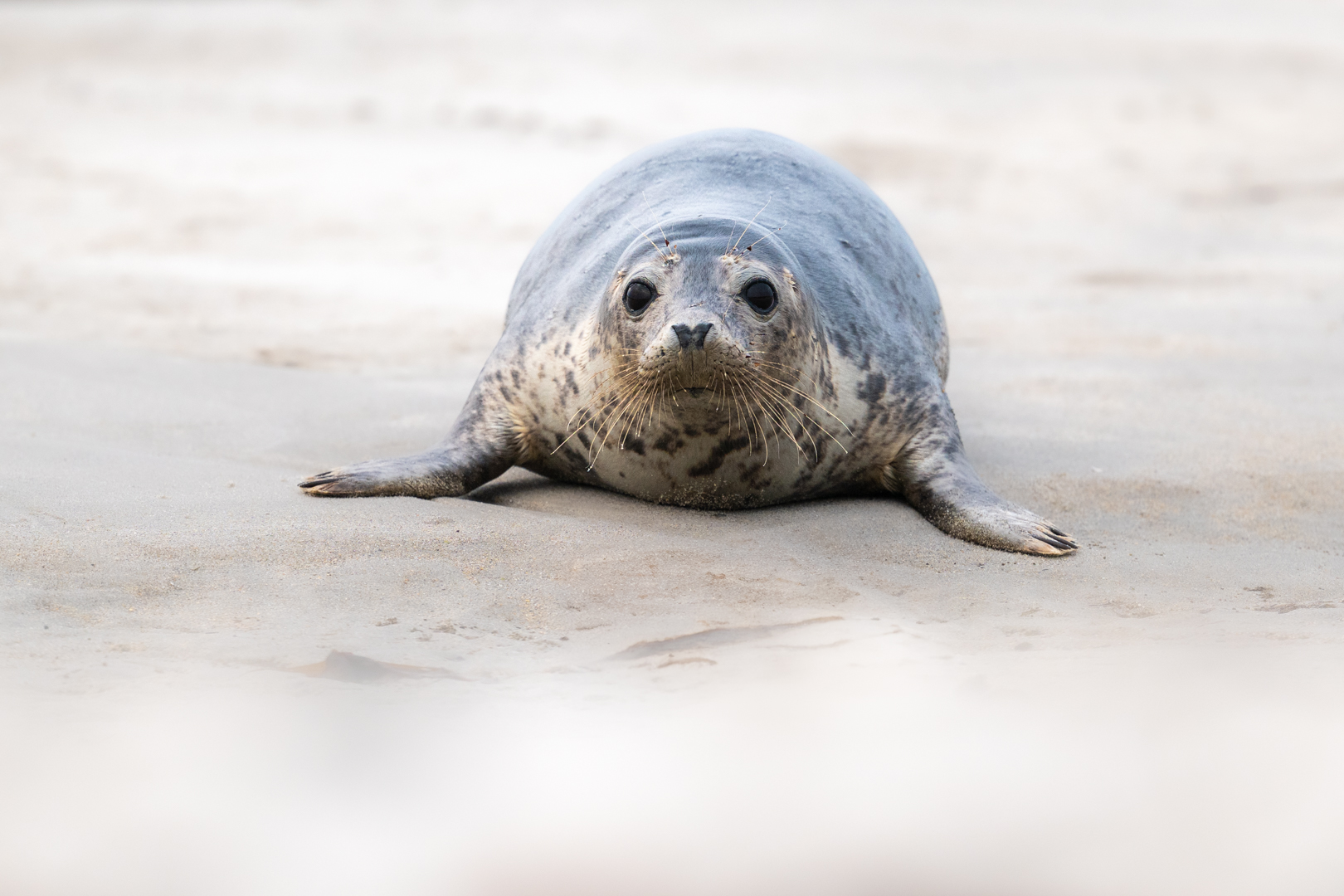 Mooi frontaal portret van de Grijze zeehond, door alle zachte grijs/bruin/beige tinten is het een prettig beeld.