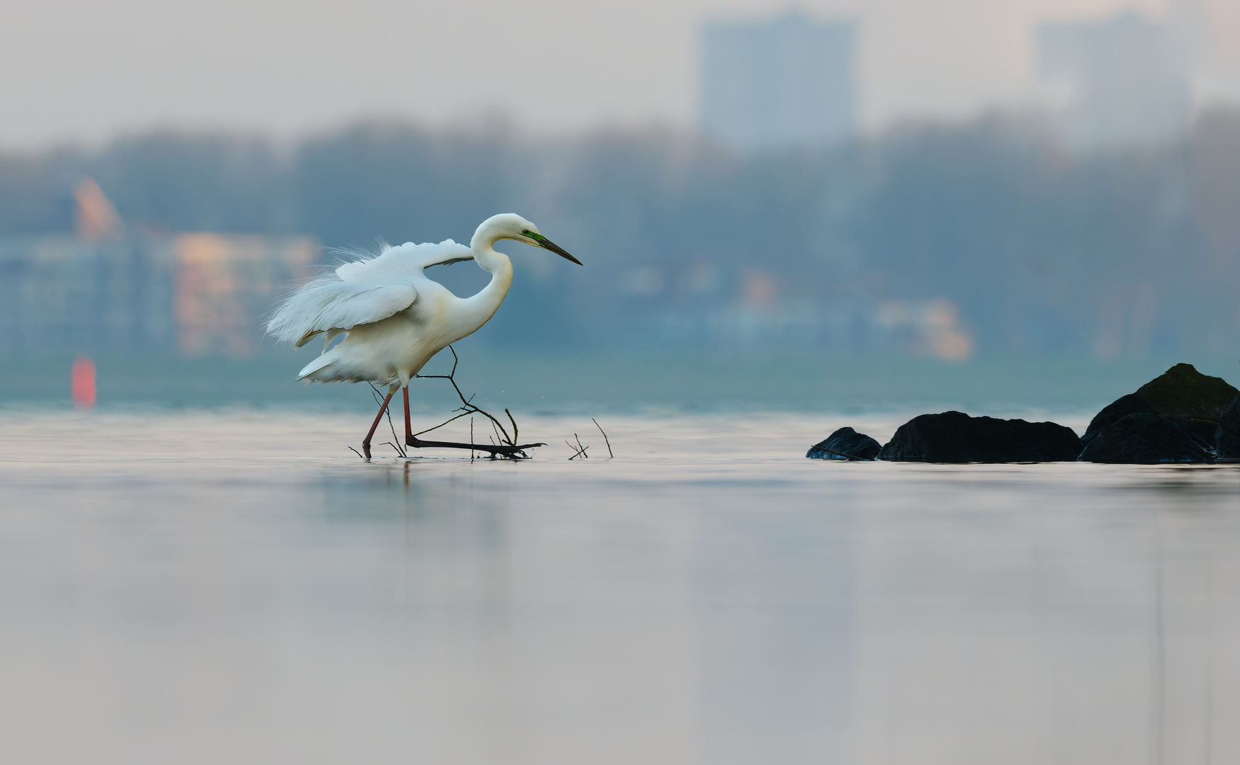 Heerlijk die beelden bij het vroege ochtendlicht vanuit jouw drijfhut. Ook dit is weer een fijne, prachtige houding van de zilverreiger, zacht blauwig ochtendlicht en heel verrassend hoe de stedelijke achtergrond hier niet storend is maar interessante aanvulling. We hebben hierom wel nog even Mens & Natuur aangevinkt.