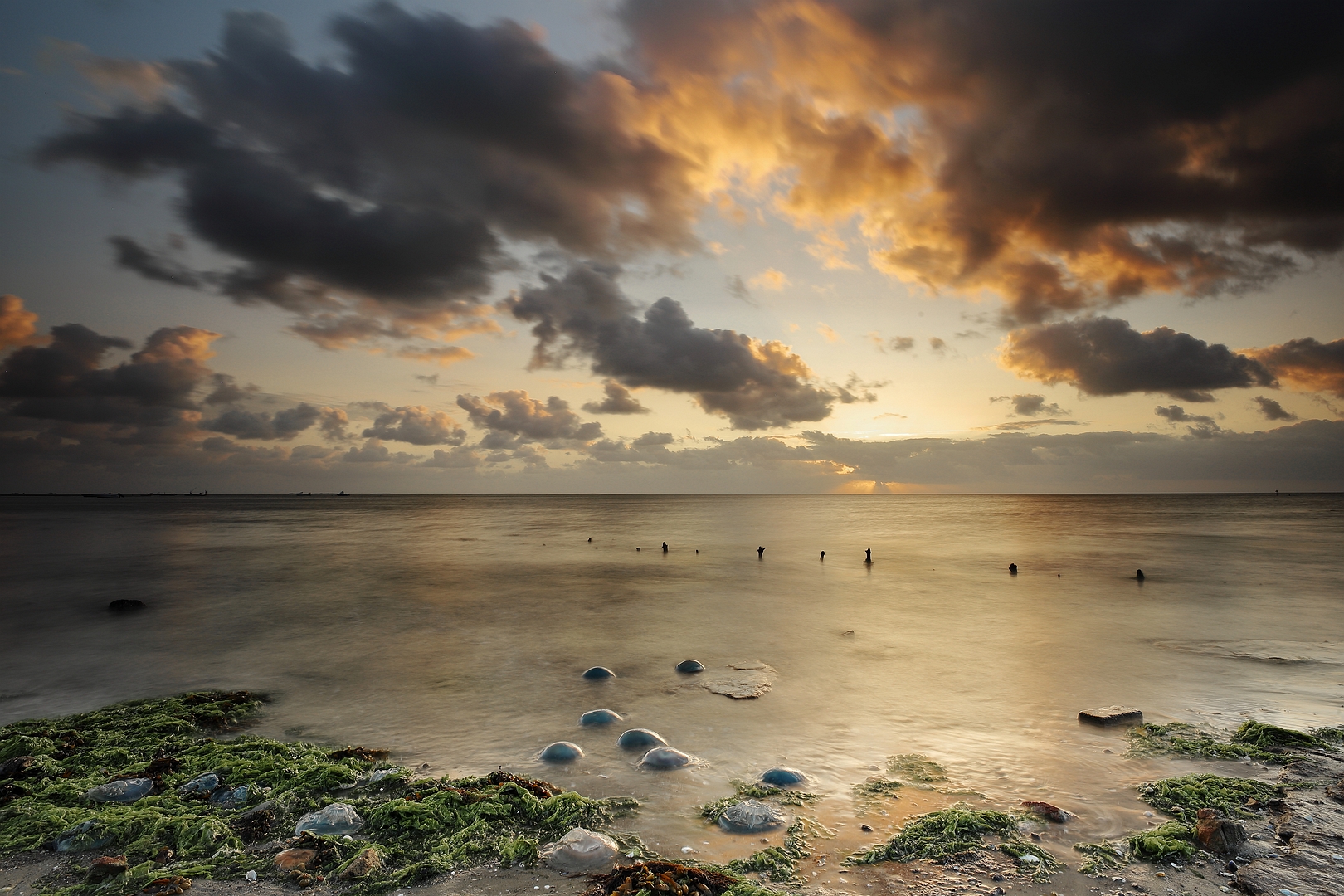 Er waren die ochtend aan de wadkant van texel een aantal kwallen aangespoeld die ik dan als een welkome invulling kon gebruiken in de voorgrond bij deze foto tijdens de zonopkomst.