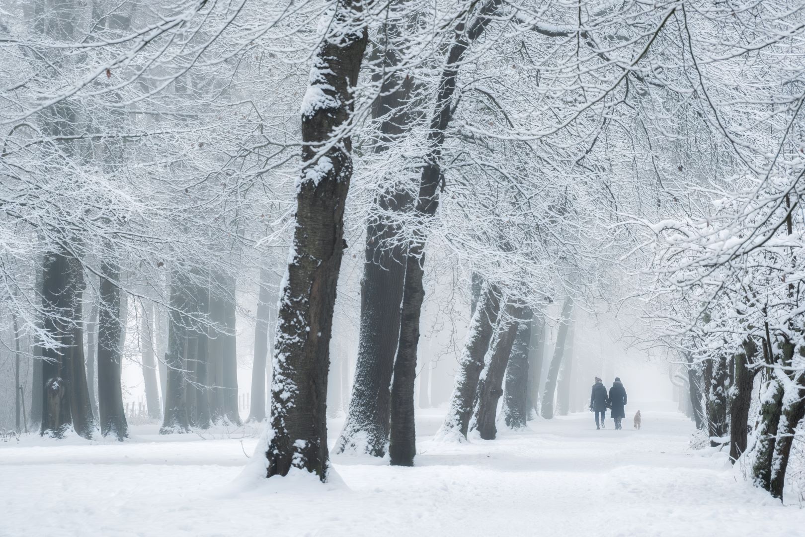 Op landgoed Soelen in de Betuwe kom je vaak wandelaars tegen met hun trouwe viervoeters. Deze twee wandelaars met hun hond liepen dit prachtige bomenlaantje in en genoten tussen de besneeuwde oude bomen van het sprookjesachtige winterlandschap.