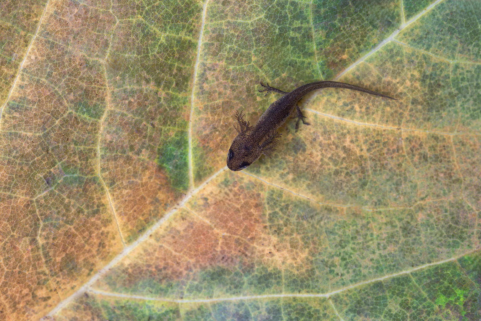 Leuk dat er zoveel leven in je eigen vijver te vinden is. Deze salamander is mooi in beeld gezet; op de juiste plek en goed gekeken naar de diagonale lijn van de nerf in het blad. Ook het blad heeft fijne kleuren.