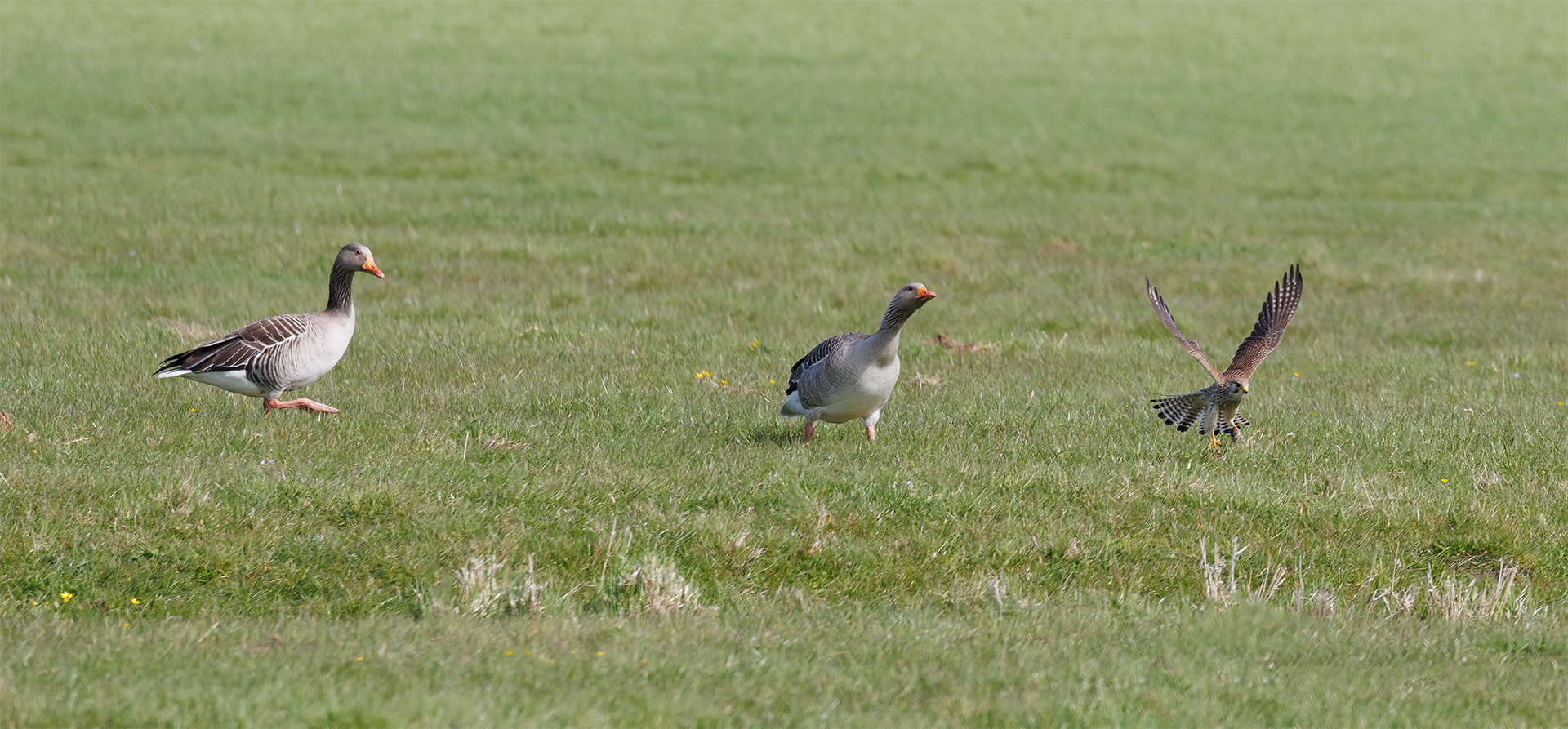 Deze torenvalk zat na haar jacht heerlijk in het zonnetje de prooi (muisje) op te peuzelen, maar de grauwe ganzen hadden helemaal geen zin in een bezoeker op hun plekkie. De torenvalk moest meerdere keren verkassen, zelf tot aan de ander kant van de sloot was deze dame niet helemaal "veilig".