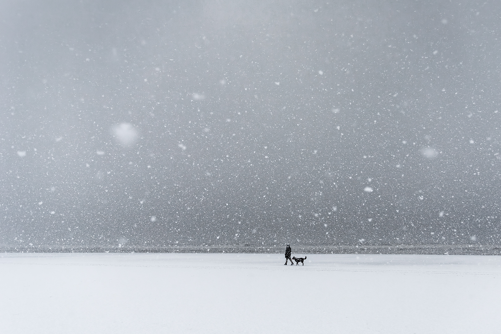 Een besneeuwd strand met een eenzame wandelaar. Nabewerkt in een eenvoudige, minimalistische en klassieke zwart-witstijl.