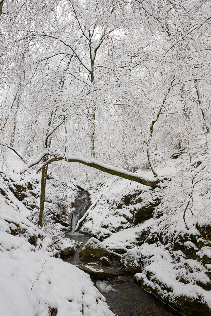In de Ardennen komt een lekker pak sneeuw gelukkig nog wat vaker voor. Een beek kronkelt langs de helling door het bos naar beneden en geeft wat orde in de takkenbende.
